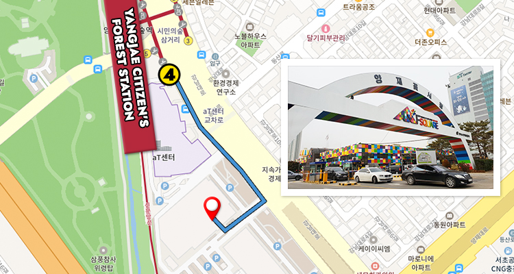Go straight 200m from Exit 4 of Yangjae Citizen's Forest Station on the Shinbundang Line → As soon as you pass the aT Center, you will see the entrance with the 'Yangjae Flower Market F-Square' arch → Enter the colorful building on the right (aT Flower Market F-Square) → When you enter the aT Flower Market main building (pictured), you will see the lobby with the security office right away (pictured). Those coming for the experience will meet in the lobby at 10:00 AM.