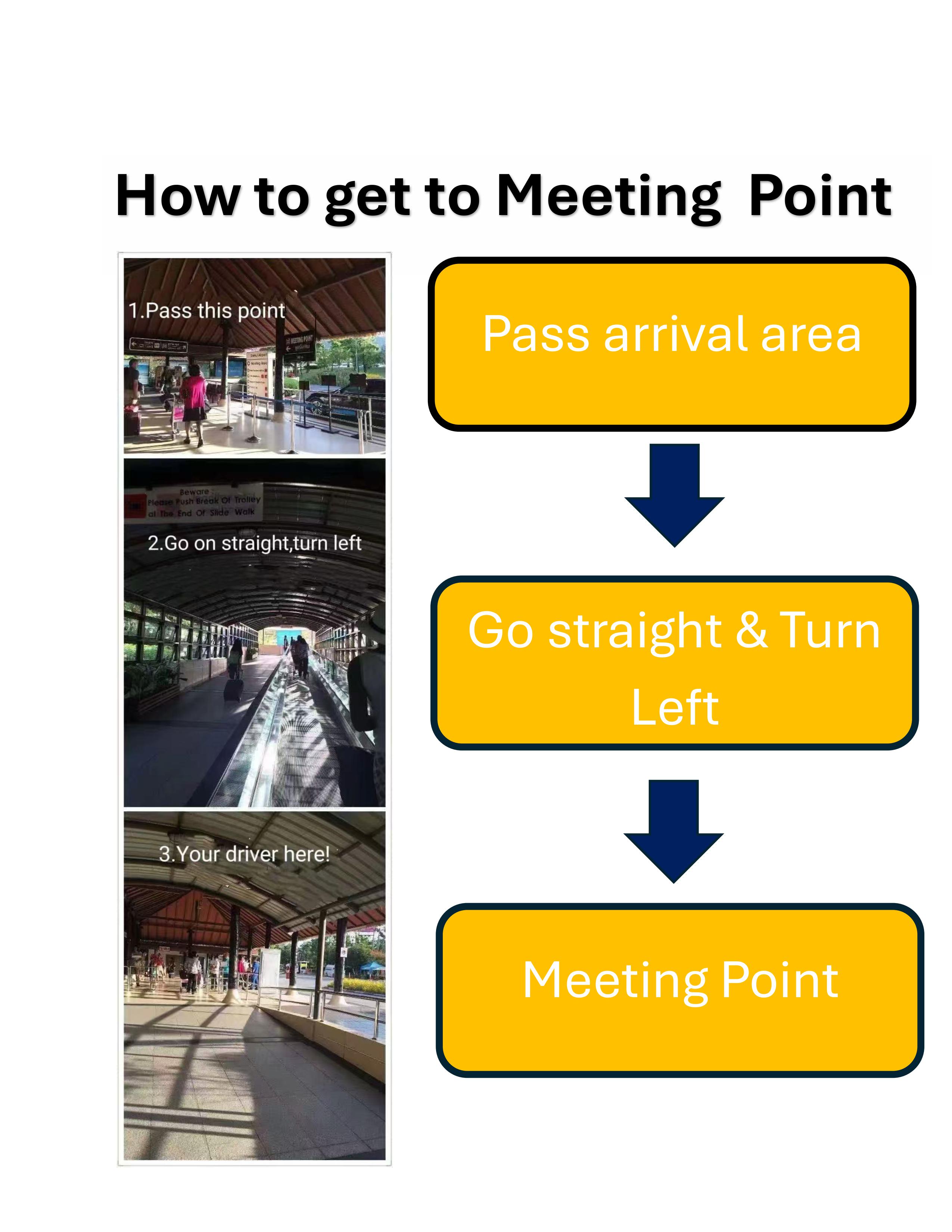* Look for the 'Meeting Point' sign and follow the sign towards the exit where your driver will be waiting. Check Meeting Point