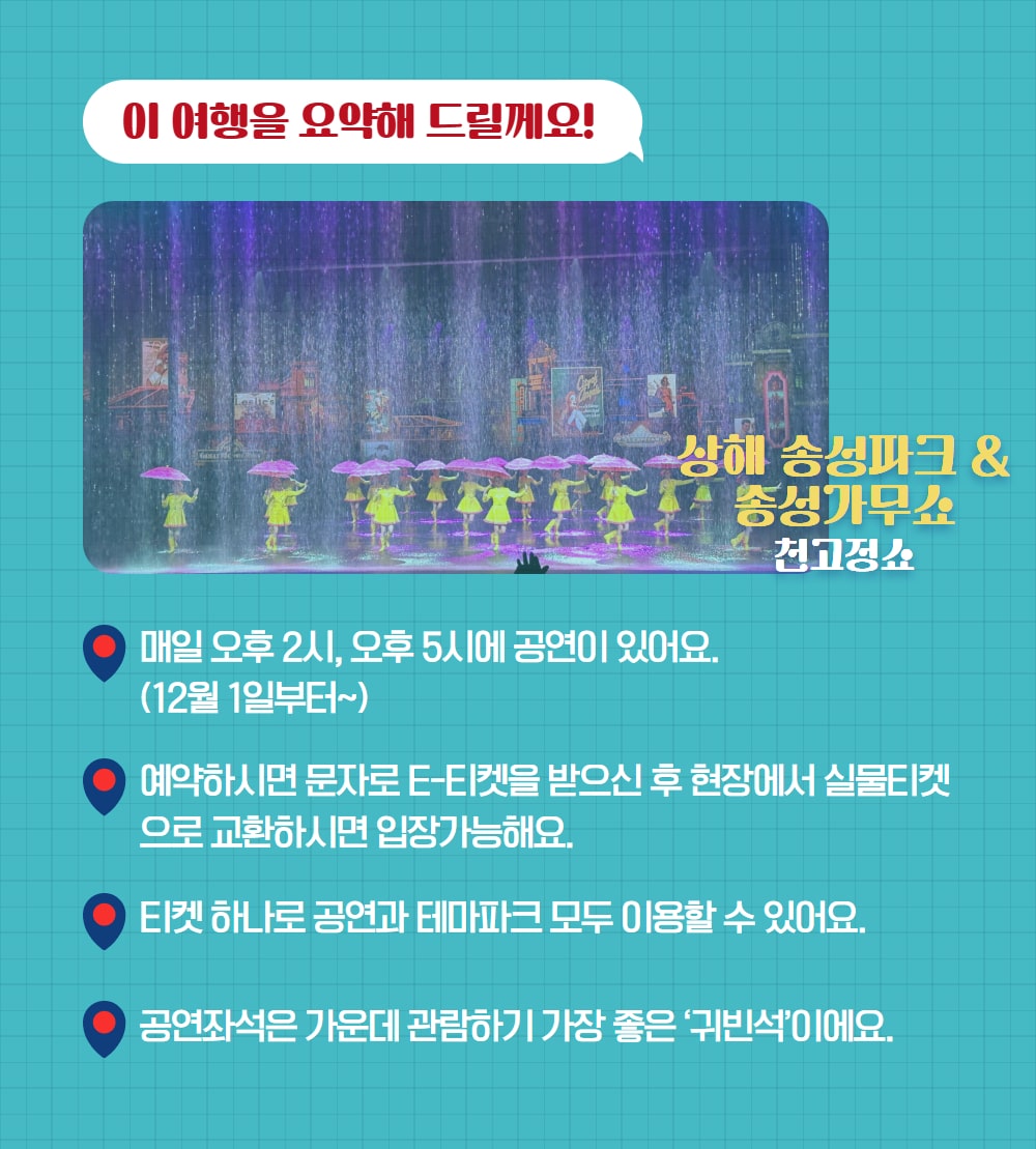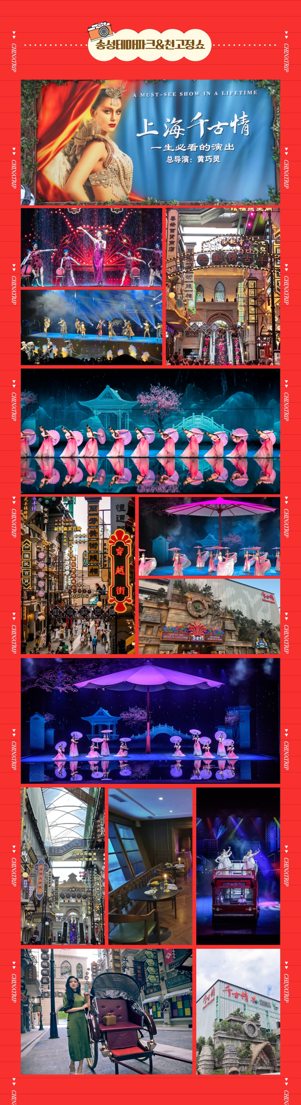 目と耳が華やかな上海へお越しの際は見逃せない必須コース! それは、ソンソンパークとソンソンガムショーです。 公演の開幕以来、なんと2万回以上開催されただけでなく、毎年2,000回以上開催されていること、ご存知ですか? それだけ最も多くの観客を動員した3大公演の名声らしく、死ぬ前に必ず見なければならない公演として名を連ねたソンソン歌舞ショー! そして様々なテーマで飾られており、中国の雰囲気を漂わせるソンソンパークで、美しい人生の写真まで撮影できる絶好のチャンスです。