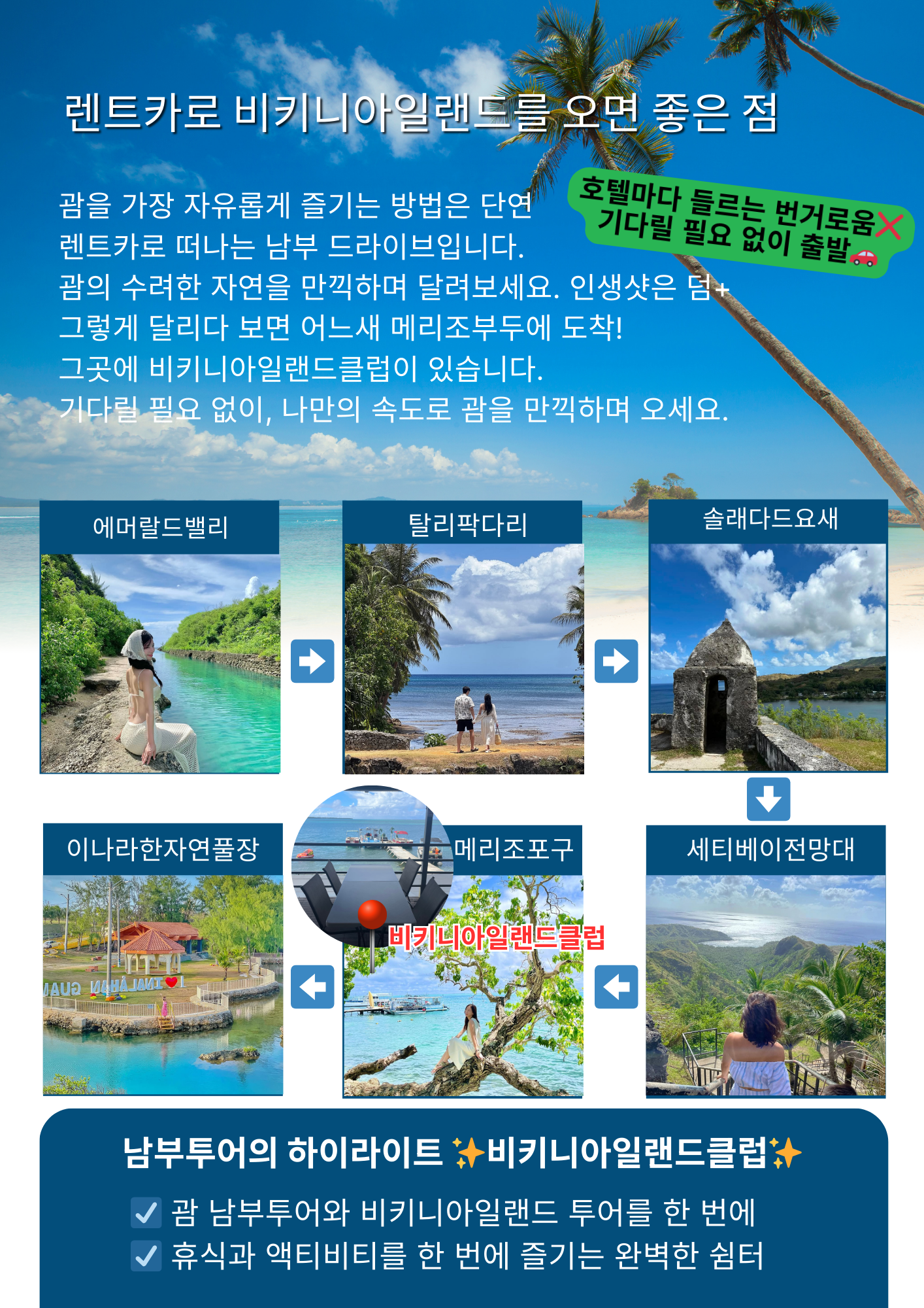 ‘ビキニアイランドクラブ’はグアム唯一のワンストップ海洋レジャースポーツ業者で、すべてのアクティビティがクラブハウス前のココスラグーンで行われるため、移動の不便さなしに様々なマリンスポーツを1ヶ所で楽しめます。パラセーリング、アクアウォーカー、ボート体験ダイビング、ジェットスキーツアー、ドルフィンウォッチング、ビキニ島ツアー、バナナボート、プライベートボートツアーなど、多彩な体験が用意されています。また、クラブハウスにはレストラン、カフェ、コンビニエンスストアがあり、水中メガネ、防水パック、アイスアメリカーノなど必要なものが手軽に購入できます。このような施設を備えた海洋レジャースポーツ業者は‘ビキニアイランドクラブ’が唯一で、美しいビキニ島で最高の思い出を作ってみてください。