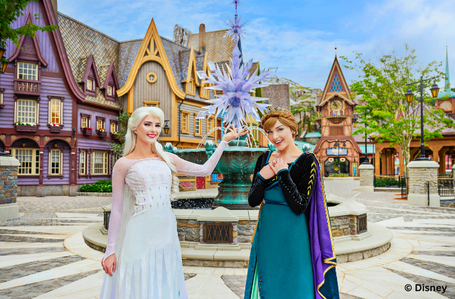 ディズニー映画『アナと雪の女王』からインスピレーションを受けた最新のテーマエリアで、アレンデール王国に入り、エルサとアナに会って、冬をテーマにした没入型体験を楽しむことができます。