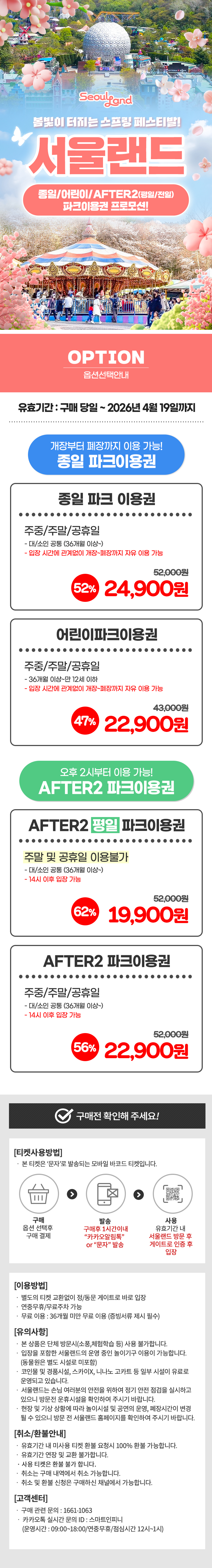 한국어 제공🎡 서울랜드, 단기간 특가 오픈! 계절마다 달라지는 테마와 밤까지 이어지는 축제 분위기 속에서 하루 종일 즐기는 짜릿한 놀이시간을 가장 특별한 가격으로 만나보세요! ✨ 판매기간 : 2026.03.16 - 2026.03.20 유효기간 : 구매일 ~ 2026.04.19