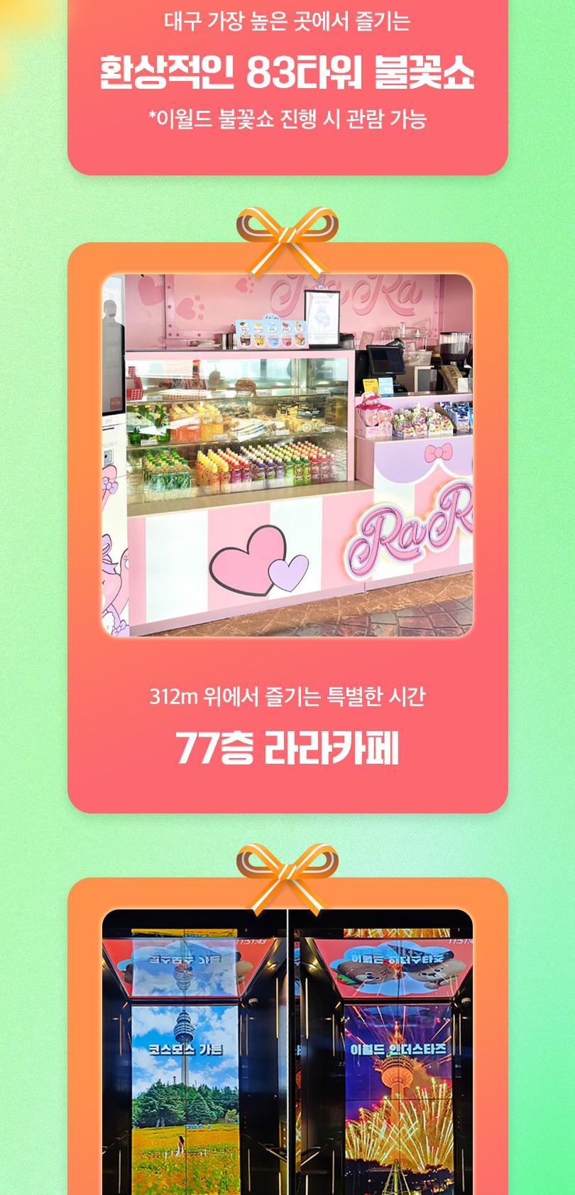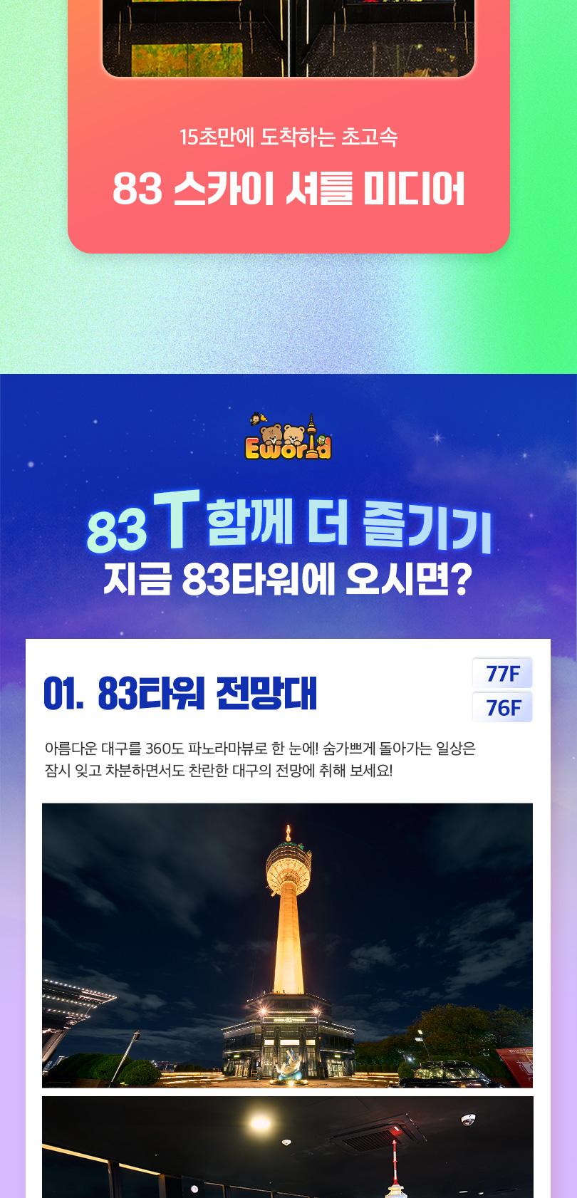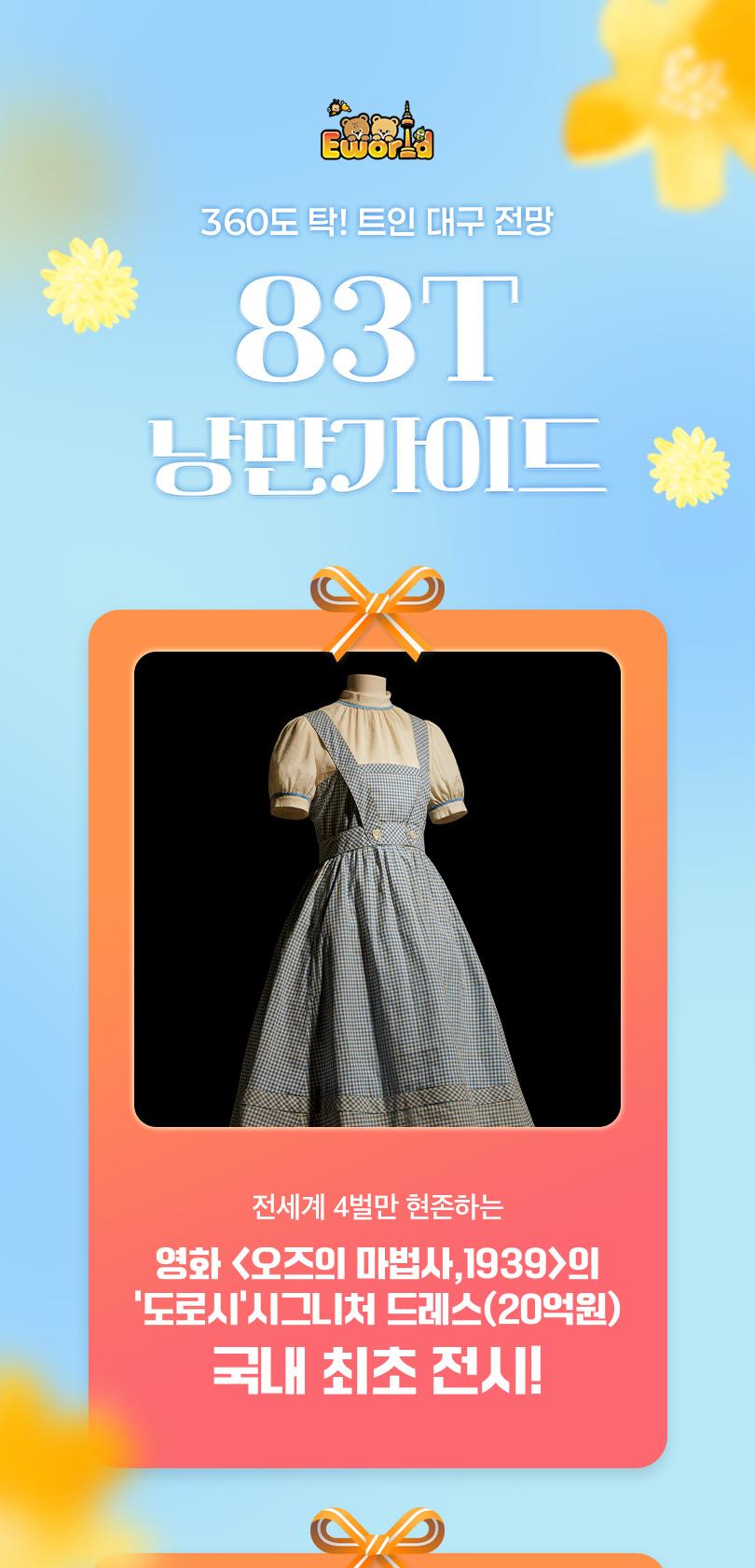 이월드 타워 전망대에서 펼쳐지는 국내 최초 뮤지컬 특별전에서 '오즈의 마법사' 실제 코스튬과 토니어워즈 트로피를 만나보세요! 이 외에도 싸이의 강남스타일 무대의상과 미디어 인터랙티브 체험을 만나볼 수 있어요. 아름다운 대구를 360도 파노라마 뷰로 볼 수 있는 낭만적인 83타워에서 바쁜 일상은 잠시 잊고, 찬란한 대구의 전망과 함께 특별한 하루를 보내보세요.