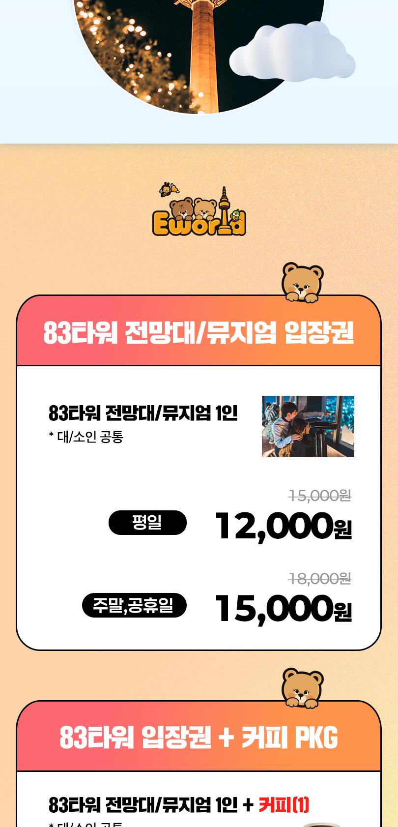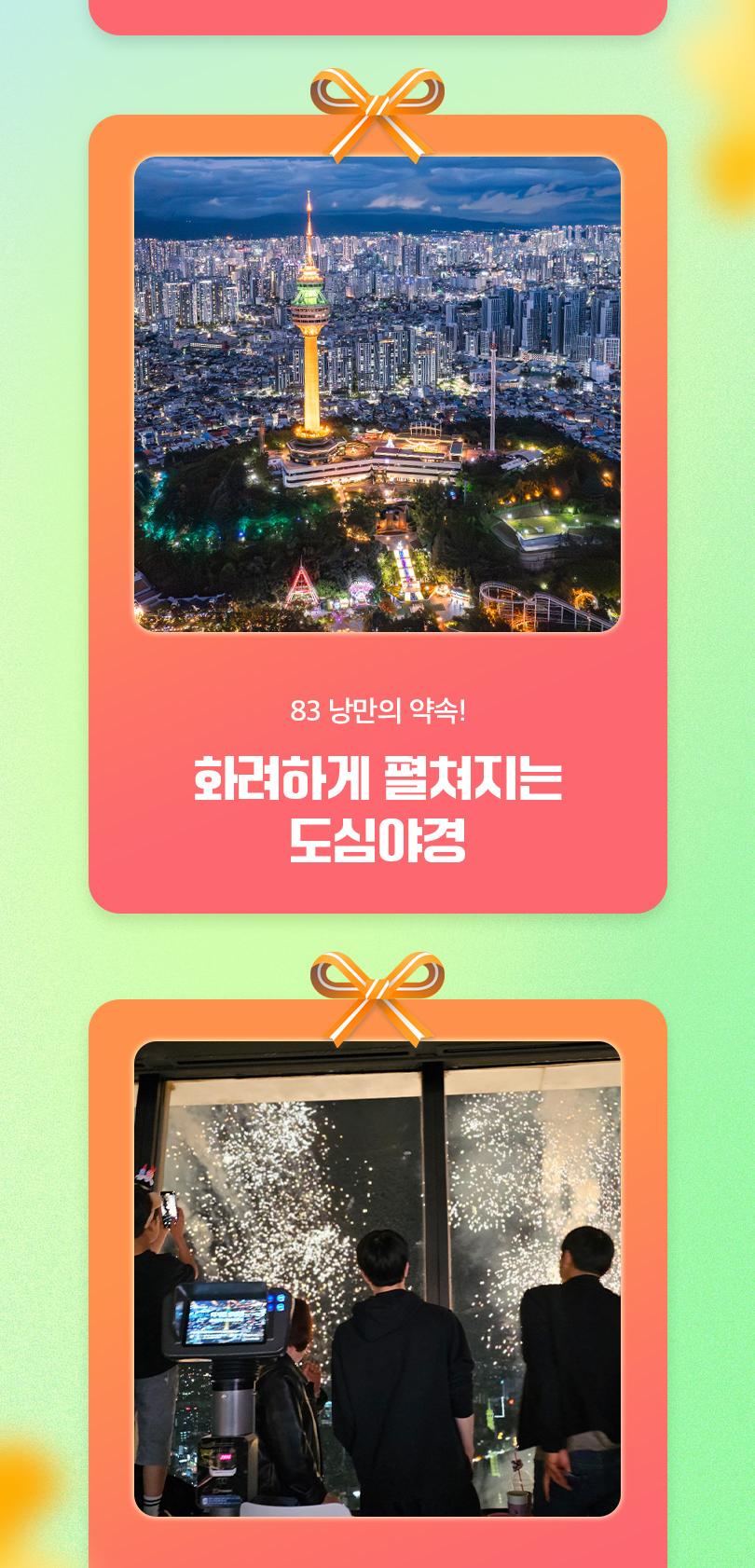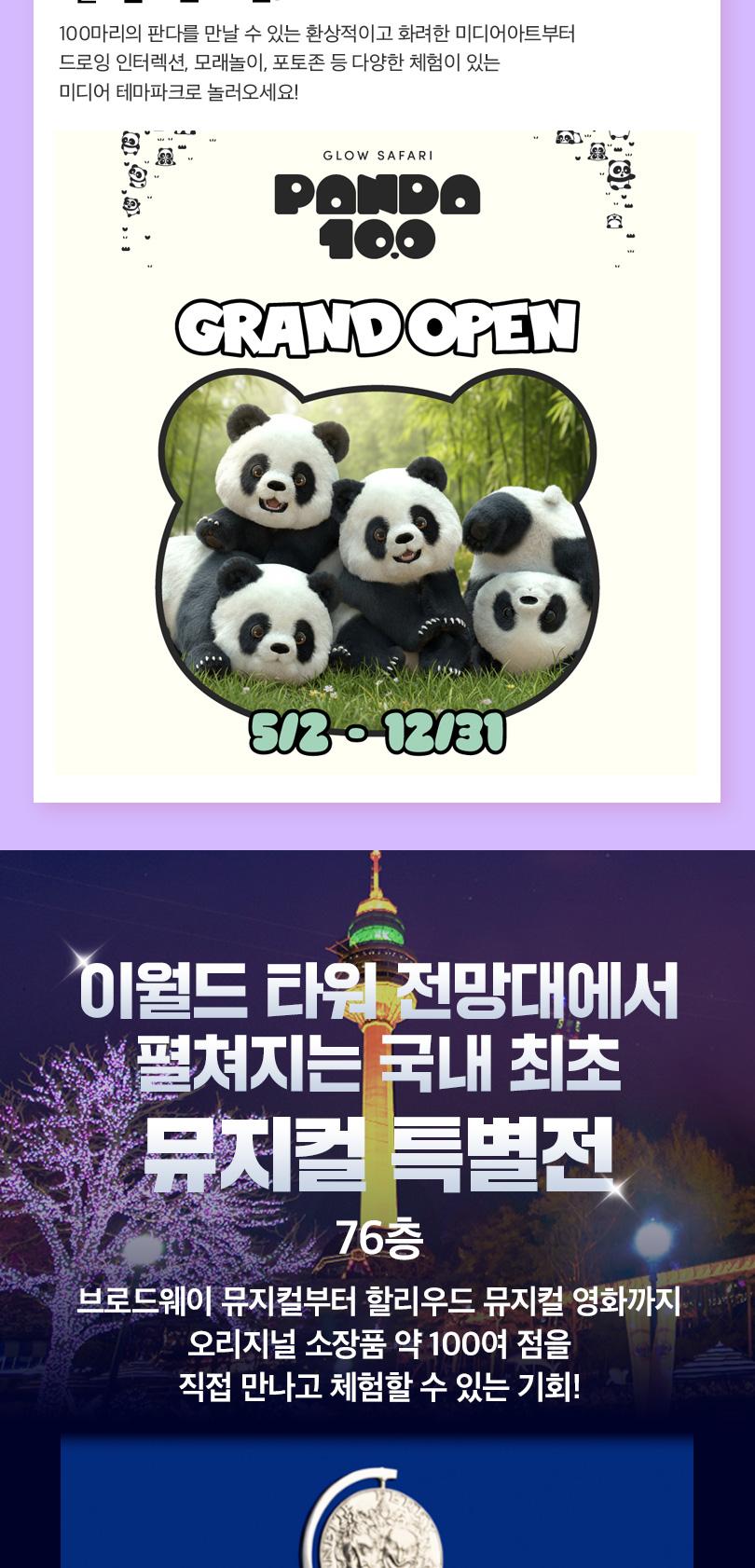 이월드 타워 전망대에서 펼쳐지는 국내 최초 뮤지컬 특별전에서 '오즈의 마법사' 실제 코스튬과 토니어워즈 트로피를 만나보세요! 이 외에도 싸이의 강남스타일 무대의상과 미디어 인터랙티브 체험을 만나볼 수 있어요. 아름다운 대구를 360도 파노라마 뷰로 볼 수 있는 낭만적인 83타워에서 바쁜 일상은 잠시 잊고, 찬란한 대구의 전망과 함께 특별한 하루를 보내보세요.