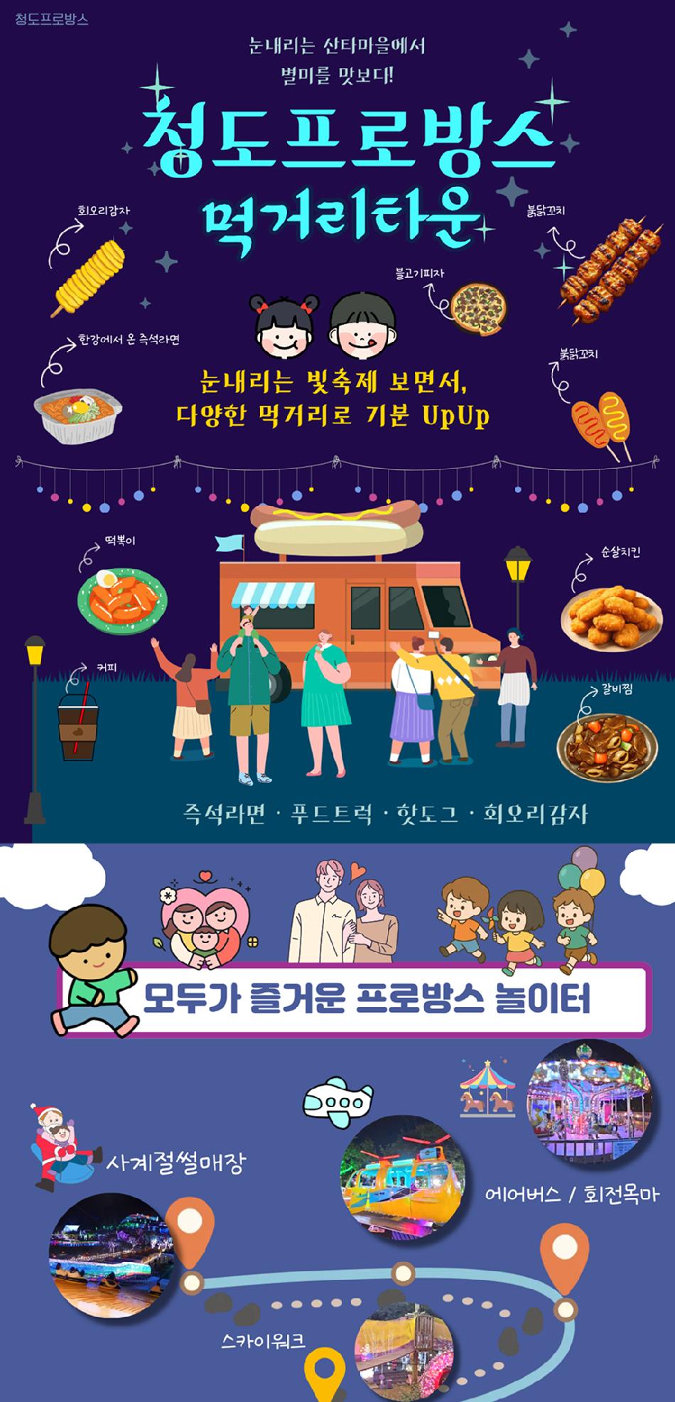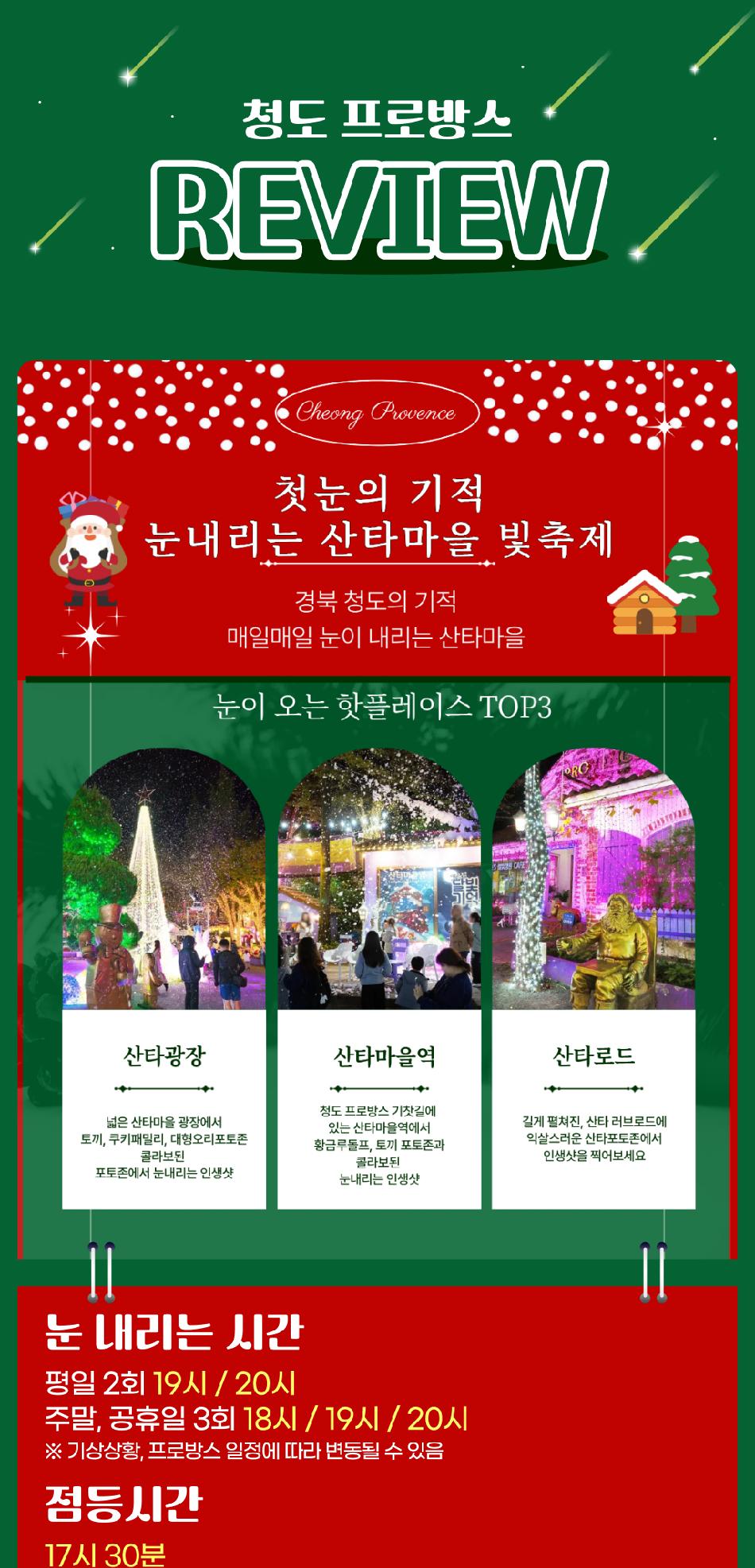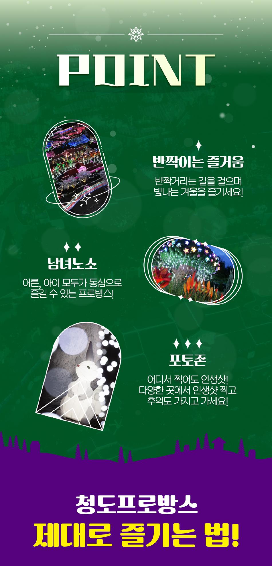 프랑스 남동부 프로방스 마을을 재현하여 이국적인 분위기를 자아내는 청도프로방스의 밤은 다채로운 빛 축제로 반짝여요. 알록달록 반짝이는 길을 여유롭게 산책하고 100여 가지 포토존에서 특별한 사진도 찍으며 즐거운 추억을 만들어 보세요.
