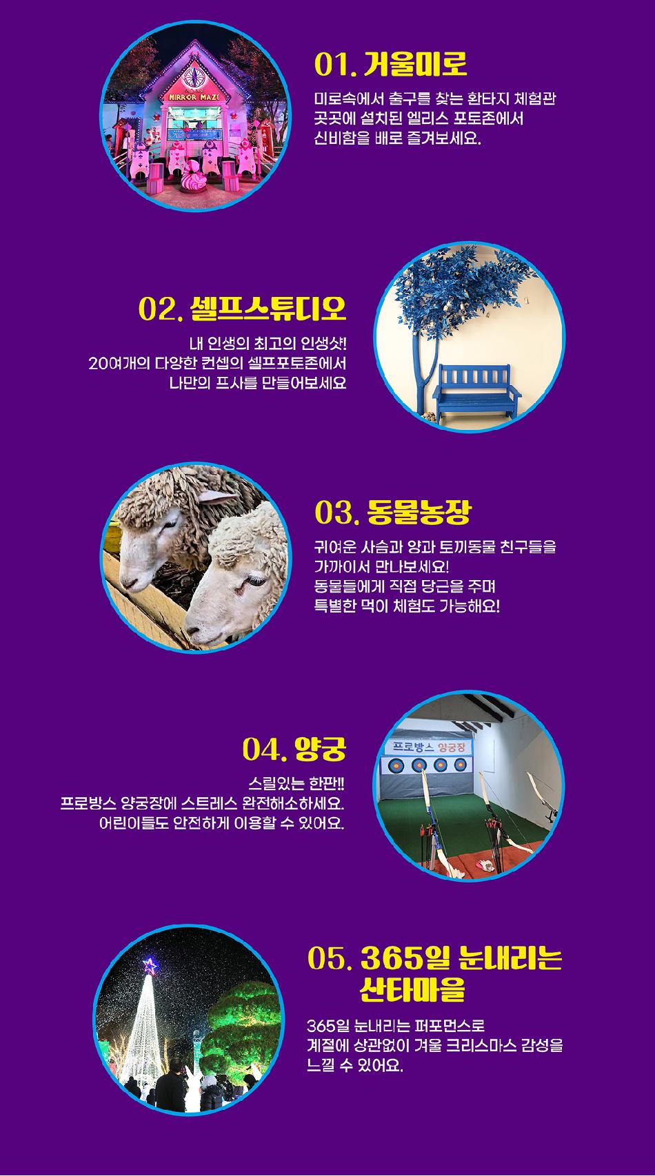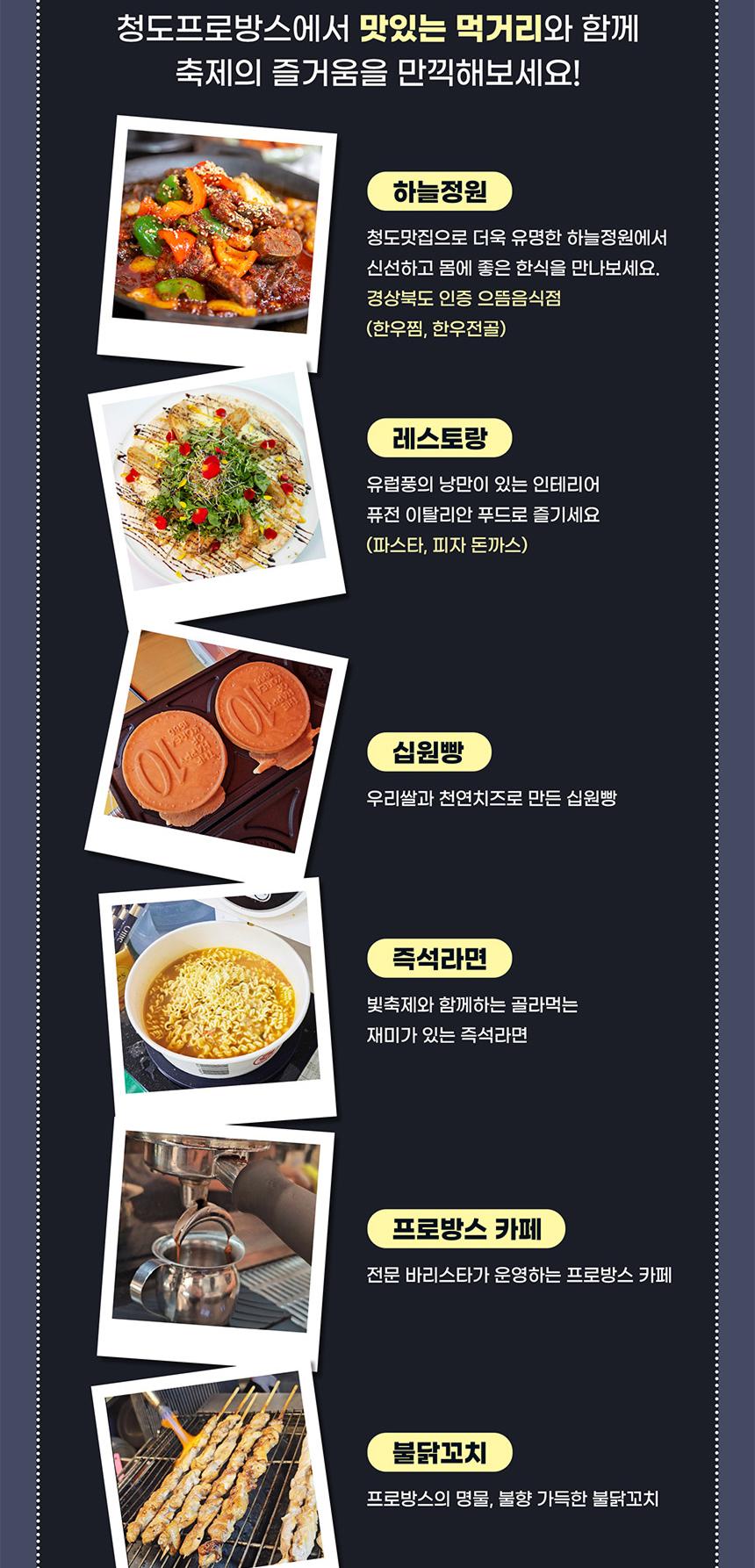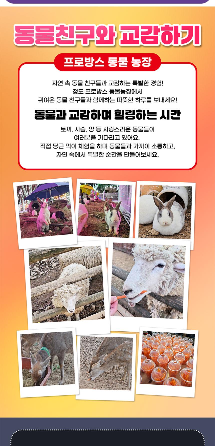 프랑스 남동부 프로방스 마을을 재현하여 이국적인 분위기를 자아내는 청도프로방스의 밤은 다채로운 빛 축제로 반짝여요. 알록달록 반짝이는 길을 여유롭게 산책하고 100여 가지 포토존에서 특별한 사진도 찍으며 즐거운 추억을 만들어 보세요.