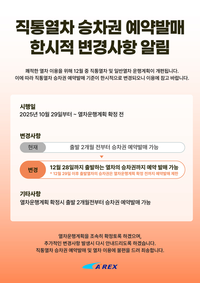 한국어 제공🚫 공항철도 AREX의 열차 운행 스케줄이 2025년 12월 29일 이후부터 변경될 예정입니다. 🚫 이에 따라 운행계획 확정 전까지는 12월 29일 이후 승차권 예약이 일시적으로 제한됩니다.