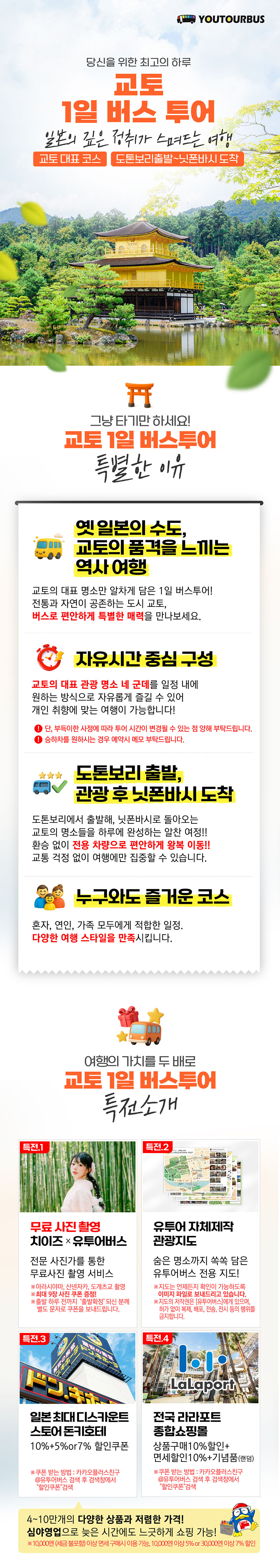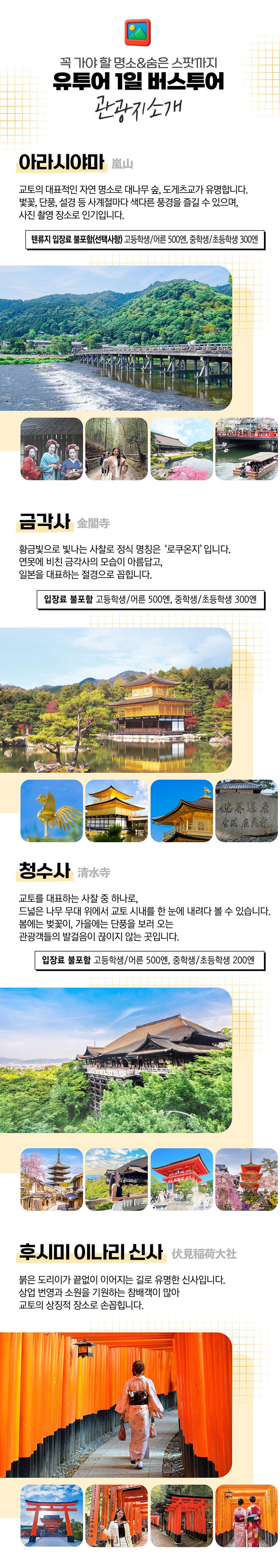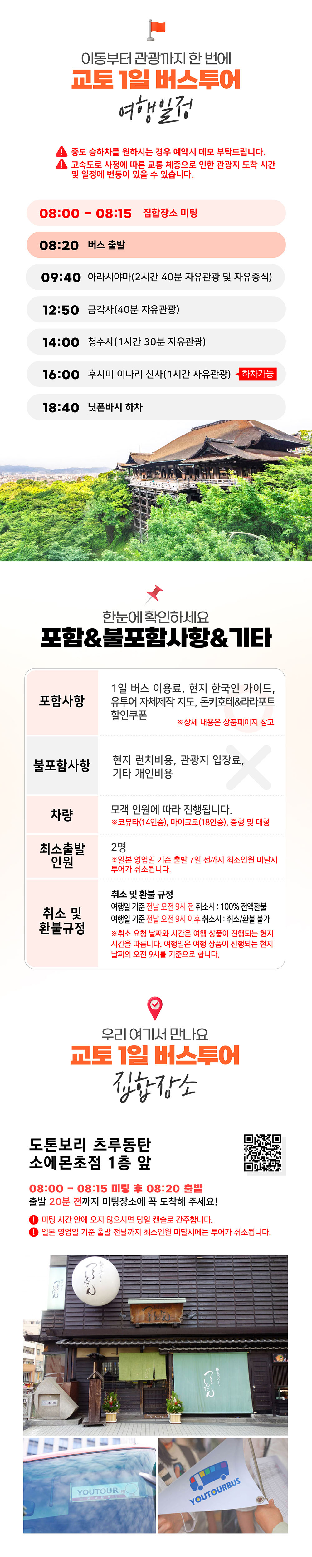 한국인 가이드가 함께 동행하기 때문에 궁금한 것들도 바로 물어보고, 더 안전하게 투어를 즐길 수 있으니 좋아요! 투어 종료지는 닛폰바시로 투어 종료 후에 자유롭게 쇼핑을 즐길 수도 있는 교토 일일 버스 투어로 떠나보세요!