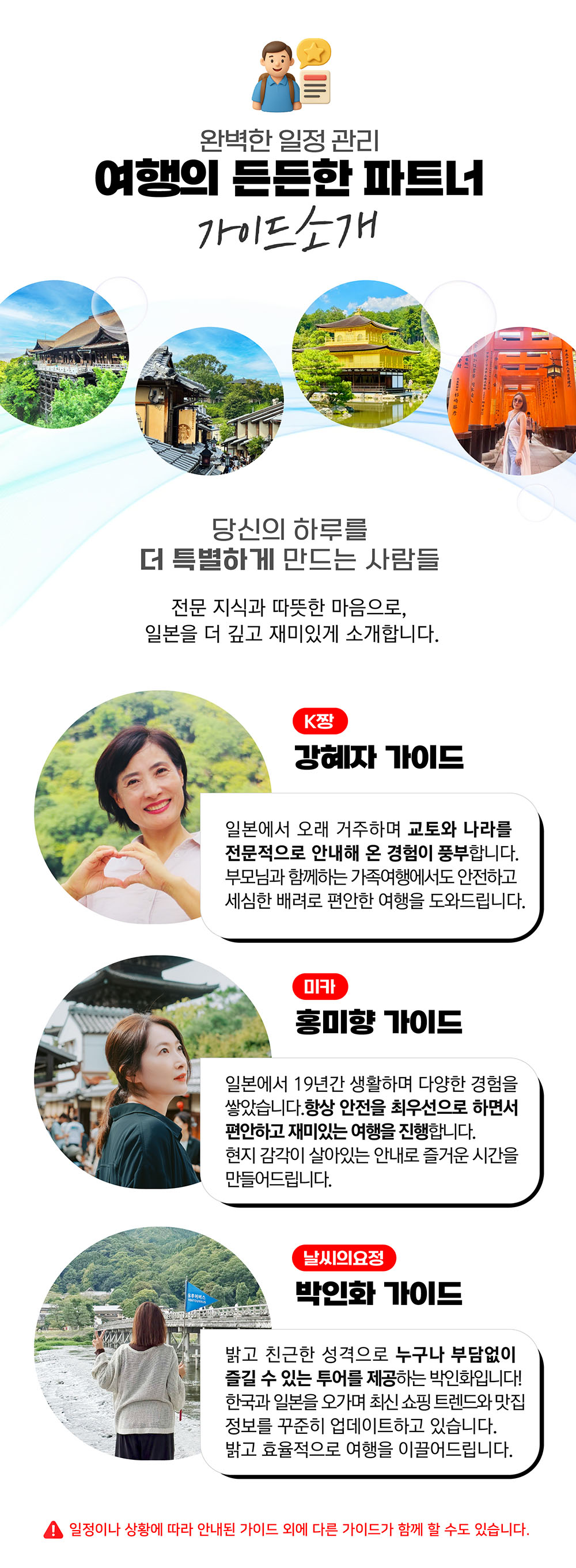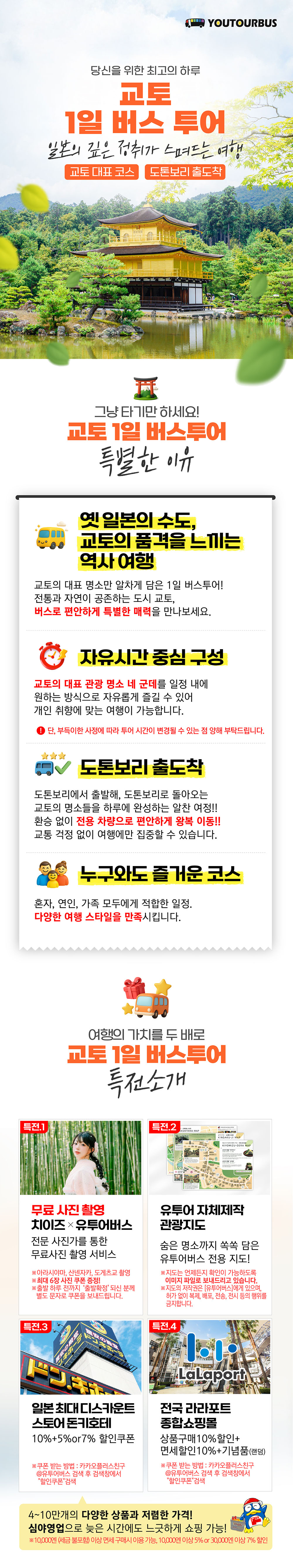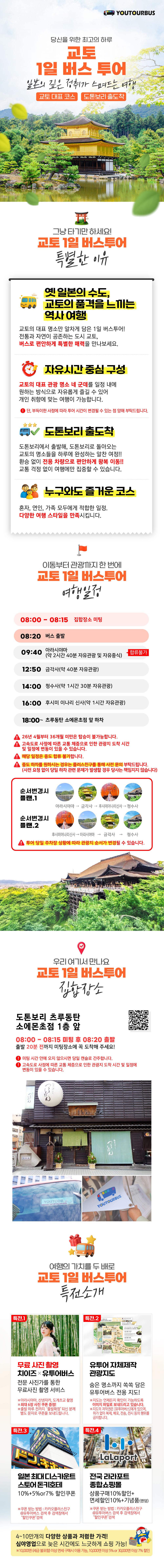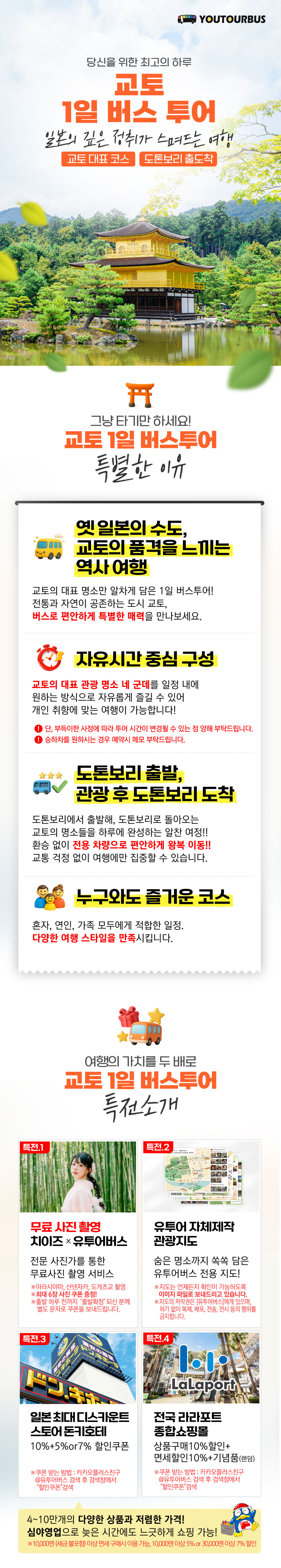 한국인 가이드가 함께 동행하기 때문에 궁금한 것들도 바로 물어보고, 더 안전하게 투어를 즐길 수 있으니 좋아요! 투어 종료지는 닛폰바시로 투어 종료 후에 자유롭게 쇼핑을 즐길 수도 있는 교토 일일 버스 투어로 떠나보세요!