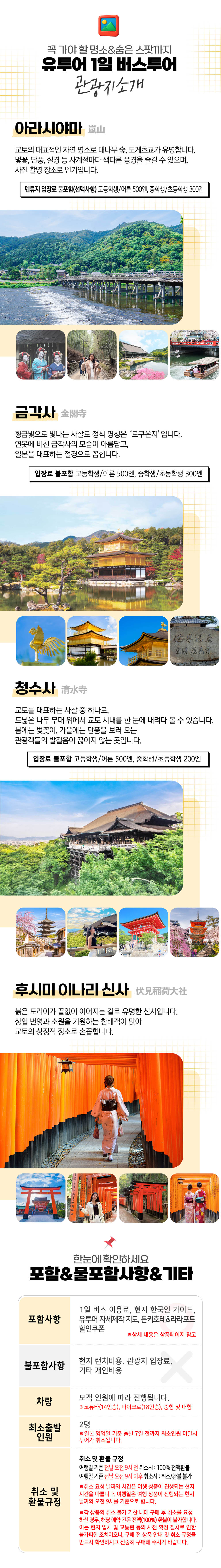 오사카에서 출발하여 일본 교토를 대표하는 여행지를 버스투어로 편하게 만나보세요. 금각사, 아라시야마, 청수사, 후시미 이나리신사까지 교토 여행지를 편하게 방문하고 마음껏 예쁜 사진을 찍고 즐길 수 있어요.