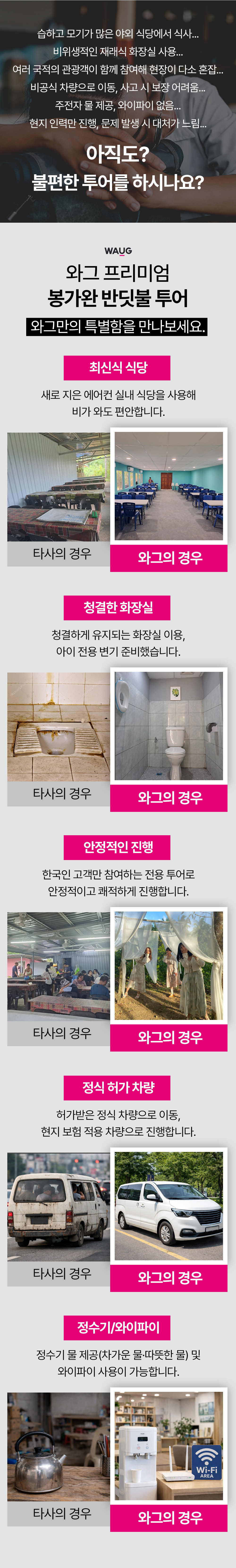 그리고, 투어 중 제공되는 식사와 휴식 시간 또한 에어컨이 가동되는 실내 공간에서 편안하게 진행돼요. 일부 투어처럼 야외에서 식사나 휴식을 해야 하는 경우와 달리, 더위나 모기·벌레 걱정 없이 여유롭게 쉬실 수 있어서 쾌적함에서 확실한 차이를 느끼실 수 있는, 만족도 높은 투어예요. 여기에 더해서 1시간마다 청소되는 신축 화장실, 무료 와이파이, 코웨이 정수기까지 준비되어 있어서 더욱 편하게 투어를 즐길 수 있도록 해드려요!