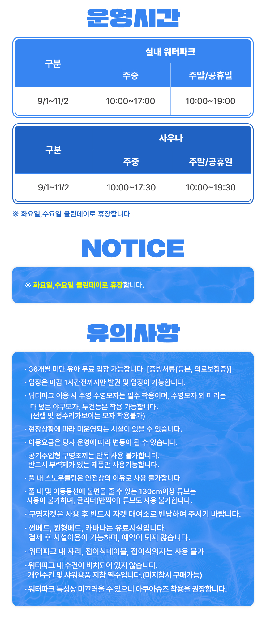 *9월1일부터 매주 화요일, 수요일은 클린데이로 휴장합니다.