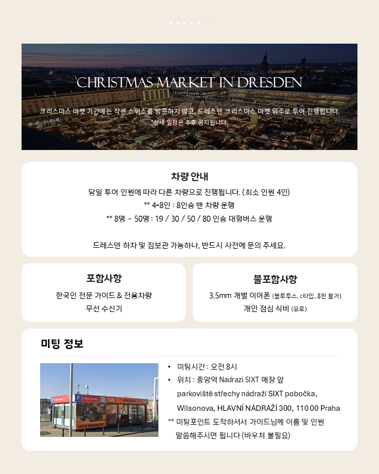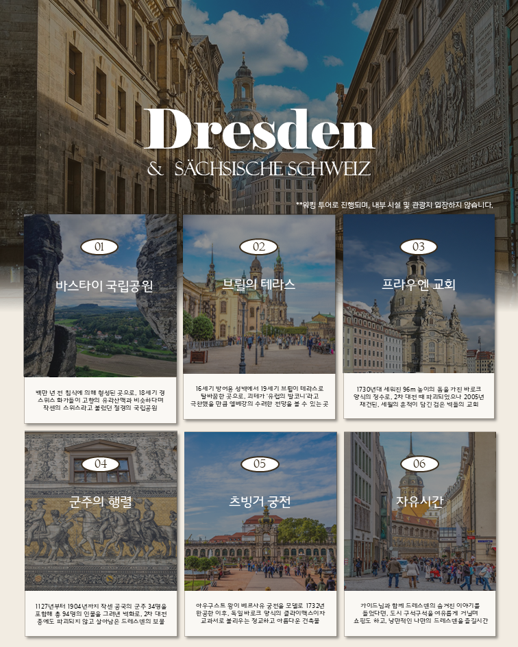 프라하에서 전용 차량으로 출발해 독일의 피렌체라 불리는 드레스덴과 작센의 스위스로 불리는 바스타이 국립공원까지 만날 수 있는 투어예요. 프라하에서 딱 하루만 시간을 내면 동유럽, 서유럽 양식이 오묘하게 조화를 이루고 있는 아름다운 도시 드레스덴을 만날 수 있어요. 전 일정 한국인 가이드와 함께하는 투어이기 때문에 의사소통 걱정 없고, 독일의 유명 브랜드 쇼핑도 할 수 있어요!