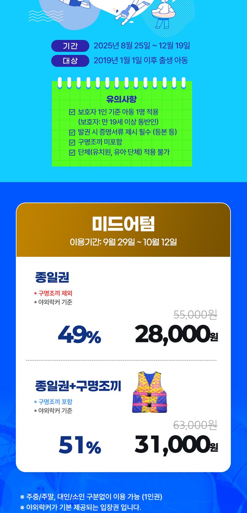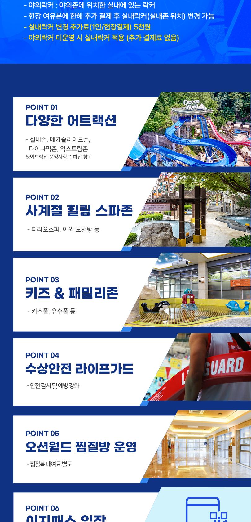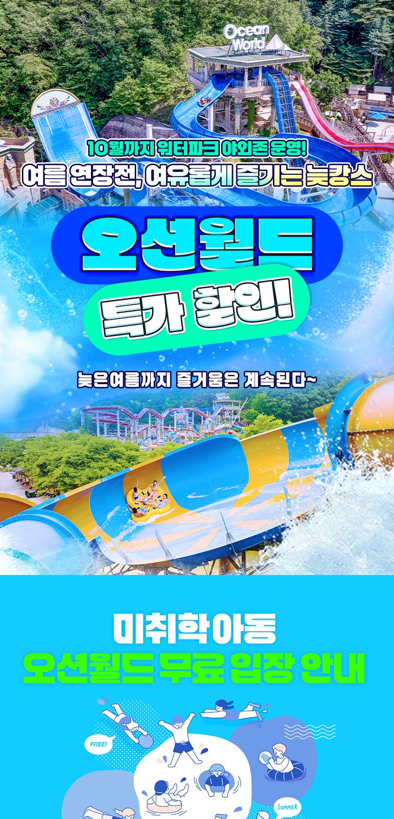 서울에서 약 1시간! 다양한 어트랙션과 사계절 힐링 스파존이 마련되어 있는 오션월드로 떠나보세요! 수상 안전 라이프가드가 항시 안전 감시 및 예방하고 있어 안심하고 즐길 수 있어요. 워터파크 외에도 찜질방, 관광 곤돌라 등 다양한 즐길 거리가 주변에 있어요. 이번 주, 오션월드에서 잊지 못할 추억을 만들어 봐요!