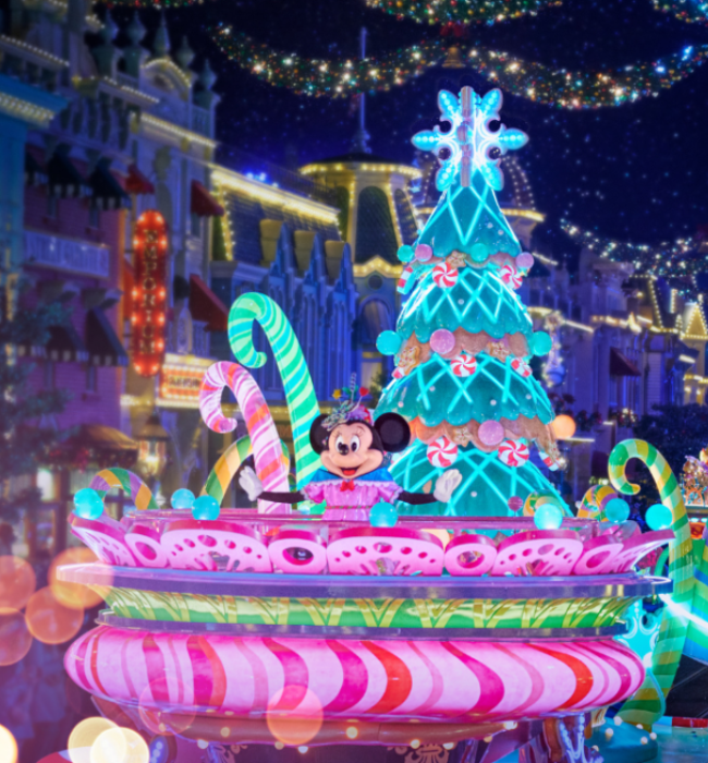 사랑스러운 디즈니 캐릭터들이 화려한 퍼레이드 차량을 타고 메인 스트리트를 활보하는 눈부신 주간 퍼레이드에요.