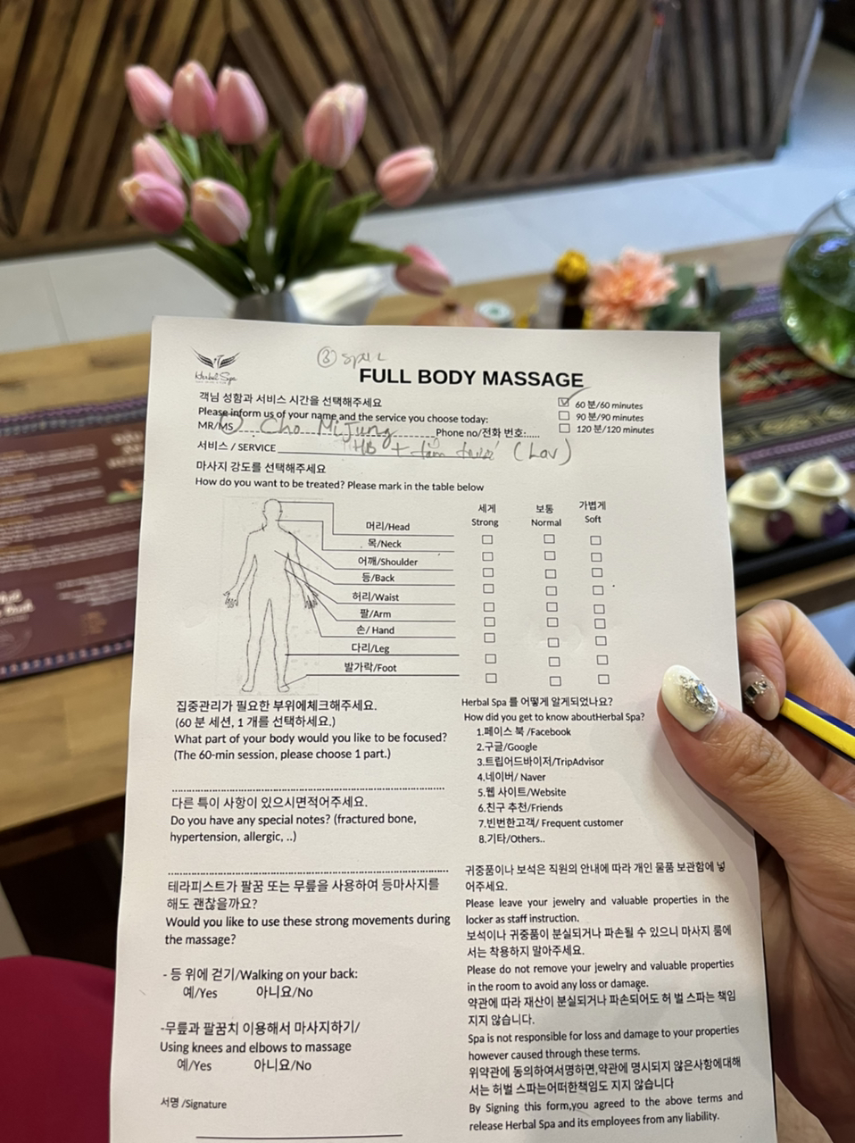 다낭 럭셔리 허벌 스파는 사전에 설문지를 통해 고객님의 건강 상태를 파악해 맞춤형으로 스파를 진행해요. 그래서 더 만족스러운 경험을 할 수 있어요. 사전에 현재 안 좋은 분위를 잘 알려주면 해당 부위를 집중적으로 케어해드립니다.