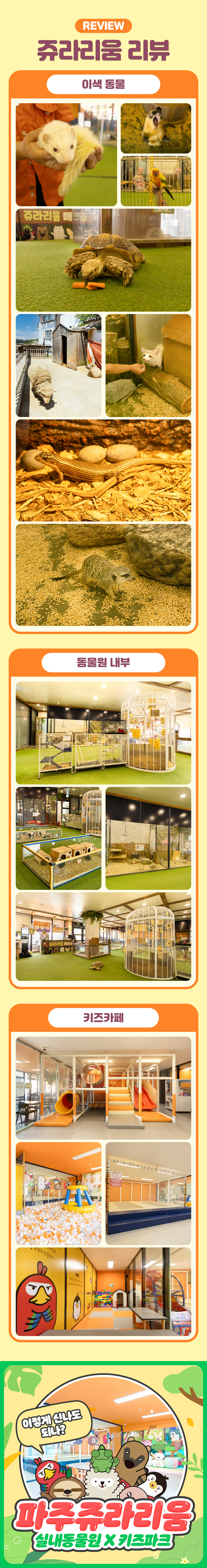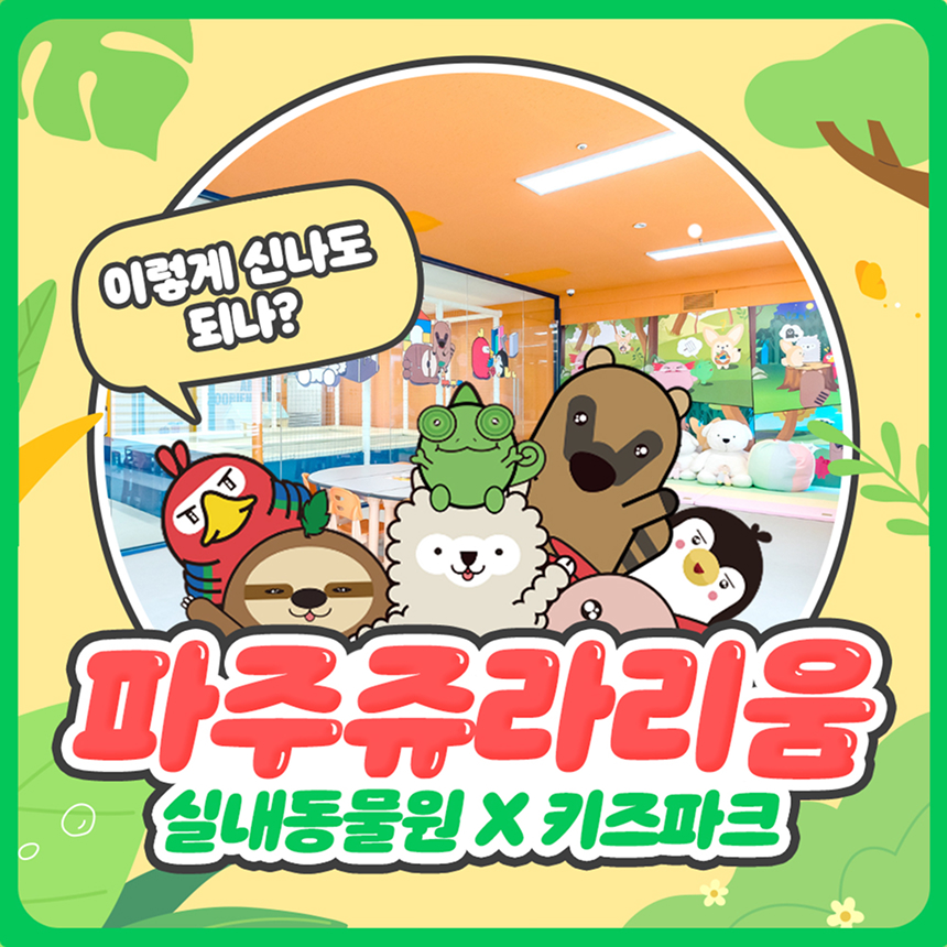 쥬라리움 파주점은 다양한 동물 친구들과 한 공간에서 교감하며 특별한 시간을 보낼 수 있는 체험형 동물 공간이에요. 귀여운 동물들과 눈을 마주치고 가까이에서 관찰하는 순간, 아이들의 호기심과 따뜻한 감정이 자연스럽게 자라나요. 💛