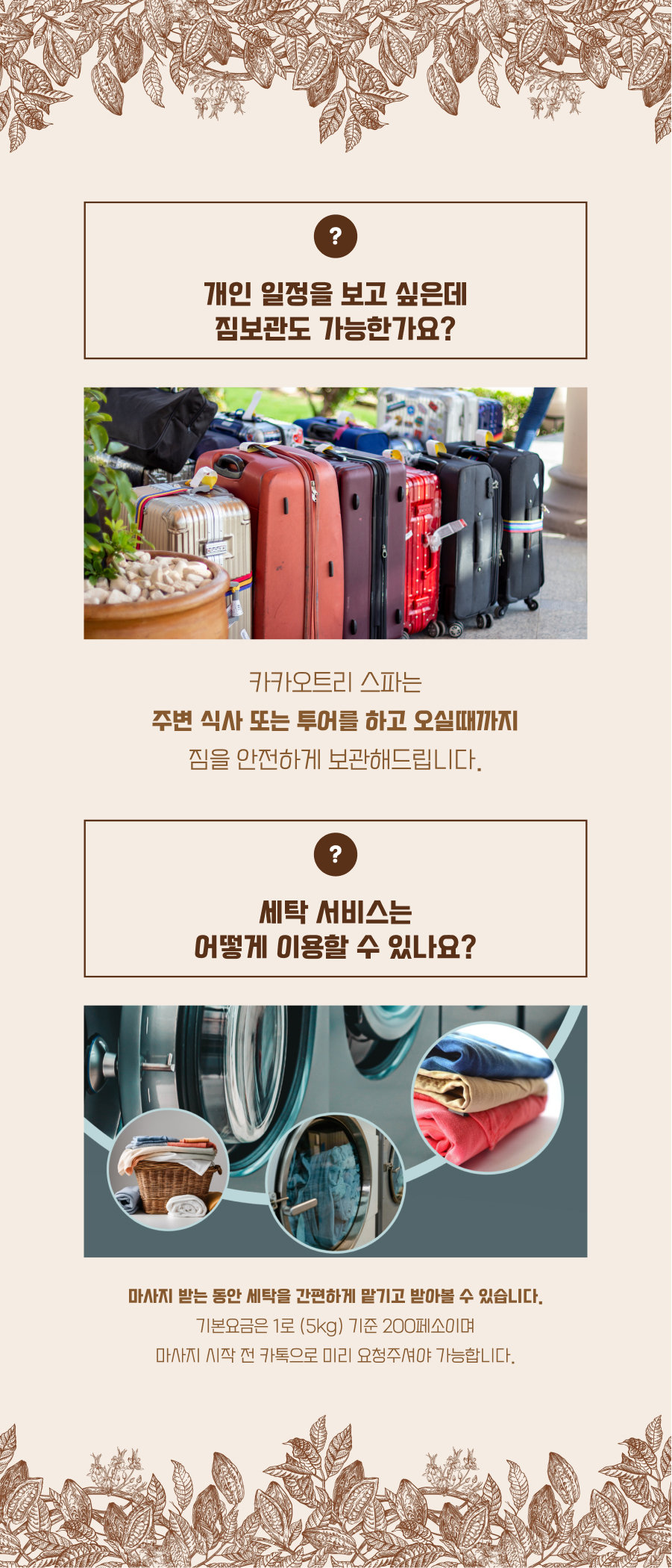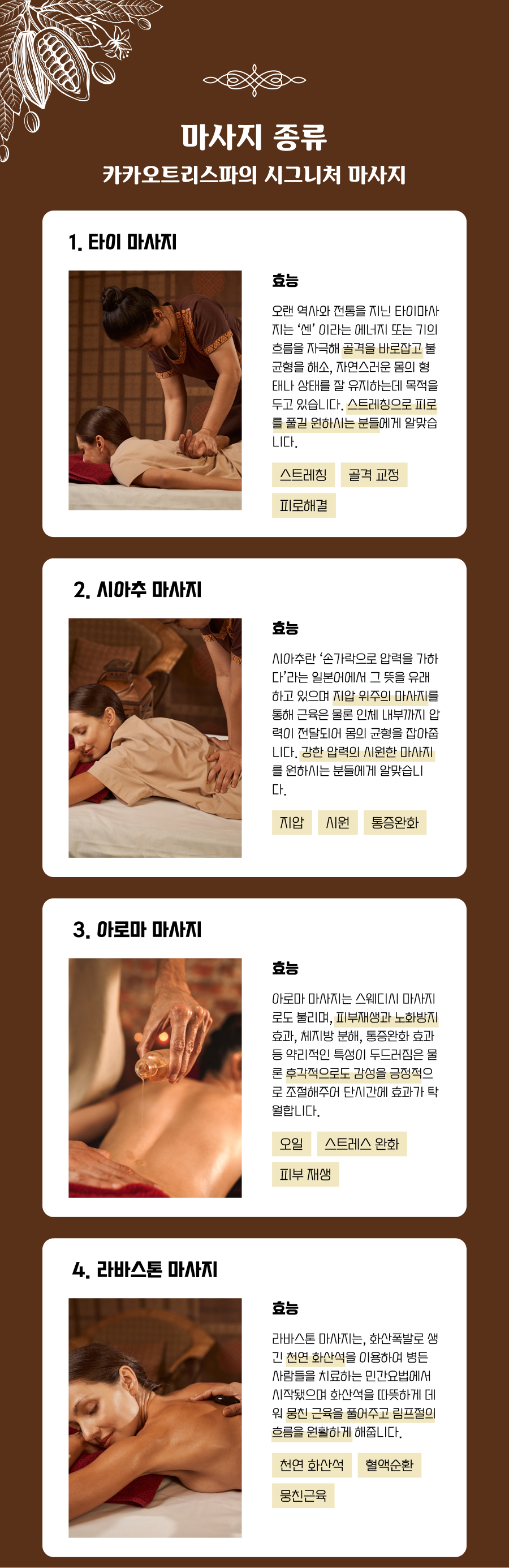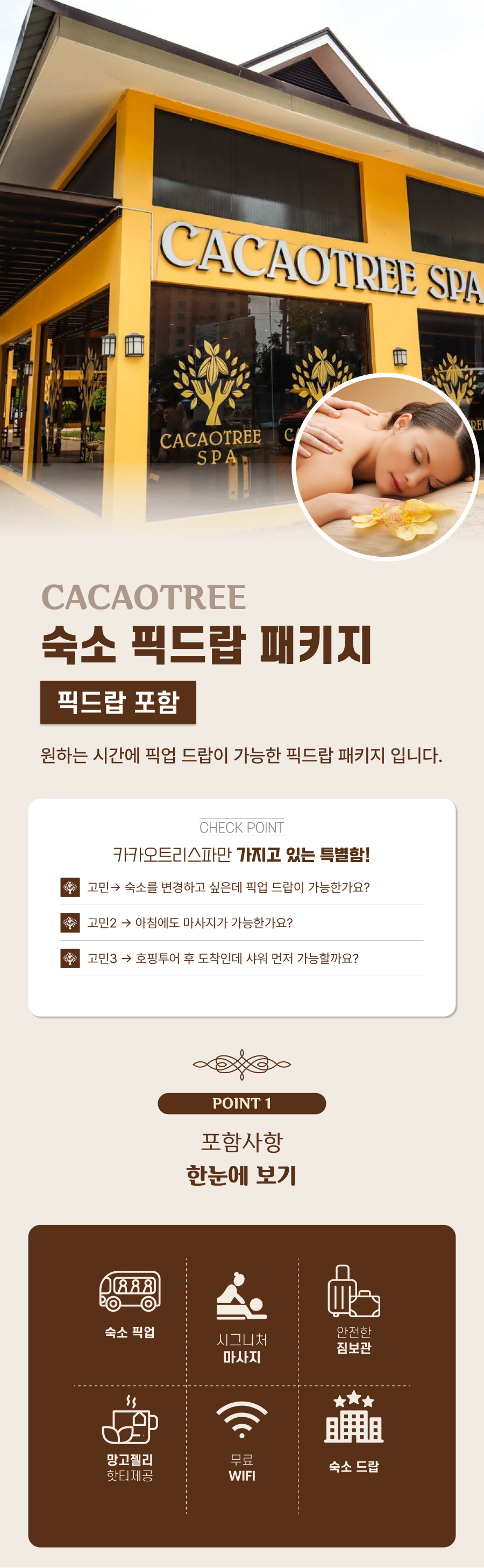 카카오트리 스파의 마사지 프로그램을 픽업, 드랍 포함으로 더 편하게 받을 수 있어요. 시아추, 타이, 오일, 라바스톤 마사지 등 다양한 프로그램 중 원하는 옵션을 선택해 이용할 수 있어요. 카카오트리 스파는 철저한 위생관리로 깨끗한 내부를 자랑하는 곳으로 다양한 스파와 최고의 테라피스트가 상주하고 있는 스파예요.