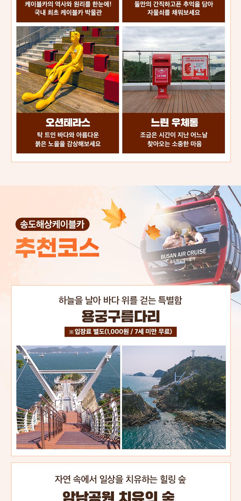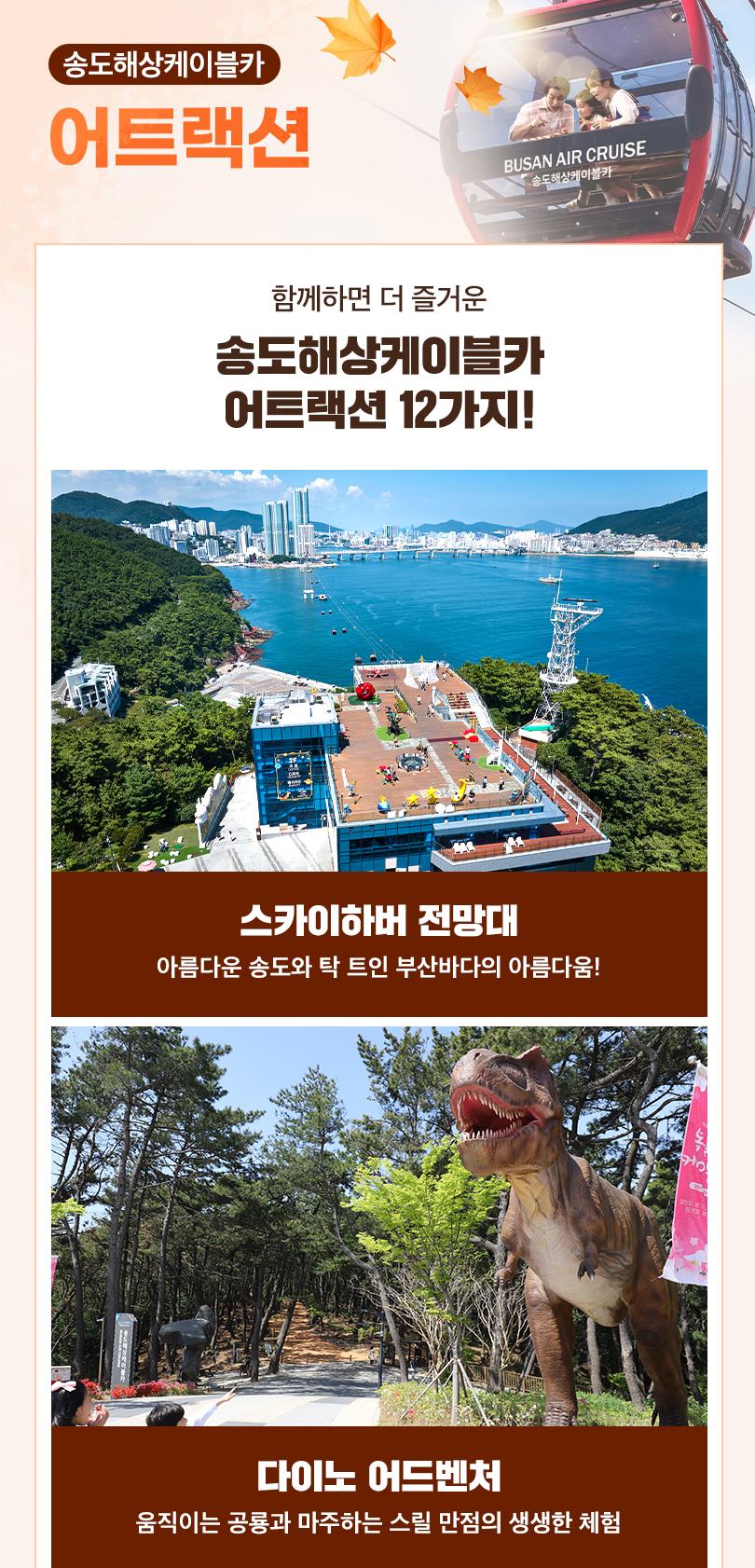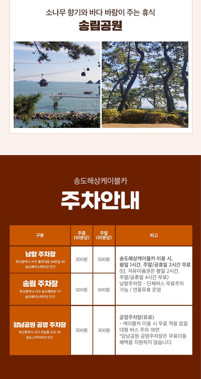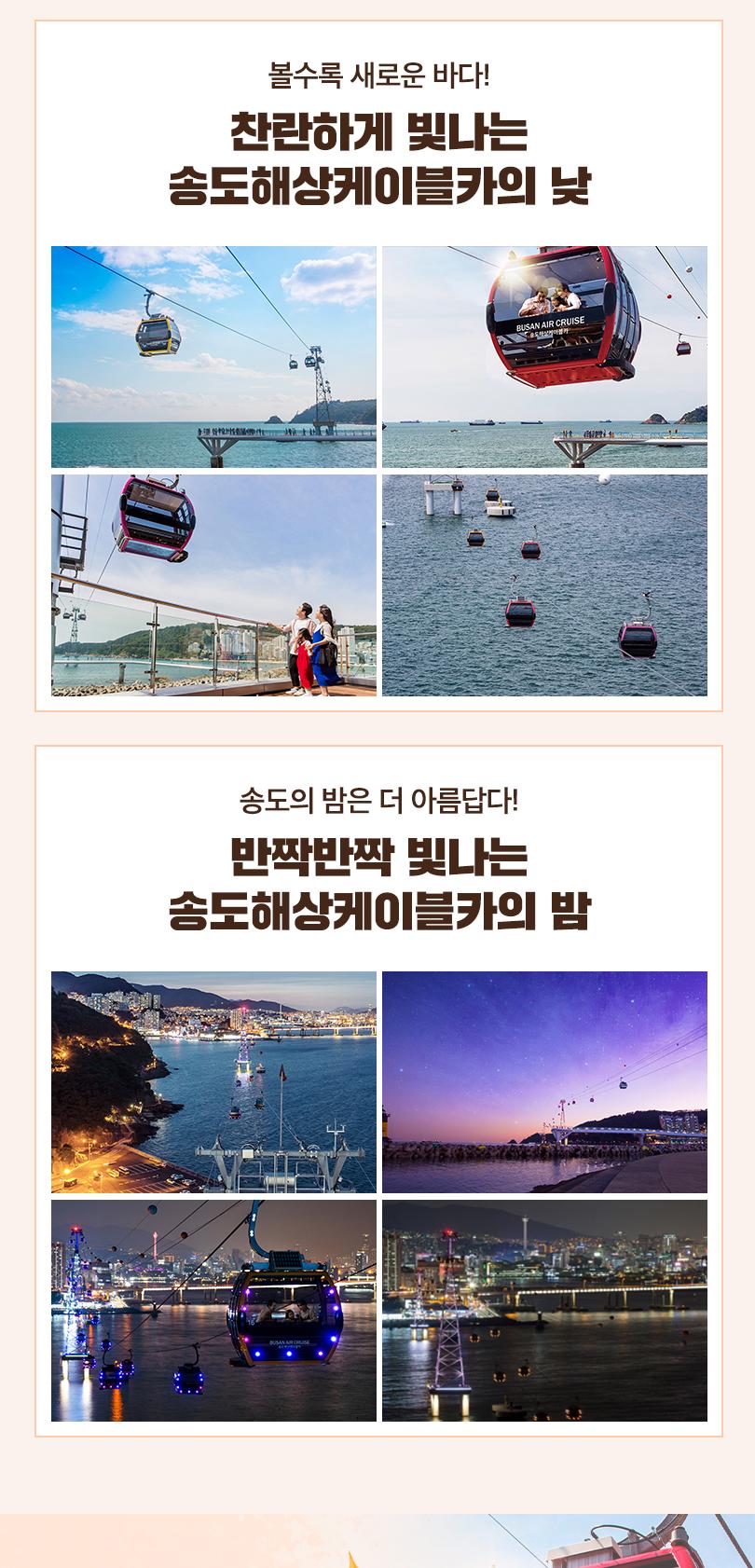 부산 송도해수욕장에 위치한 송도해상케이블카는 송도해수욕장 동쪽 송림공원에서 서쪽 암남공원까지 1.62km 바다 위를 가로질러 운행해요. 최고 86m 높이의 바다 한가운데에서 하늘을 날으는 짜릿함과 동시에 송도해수욕장, 부산 영도와 남항대교, 송도용궁구름다리, 파도치는 기암 절벽까지 한 눈에 감상할 수 있어요. 케이블카, 그 이상의 즐거움! 송도해상케이블카에서 만나보세요.