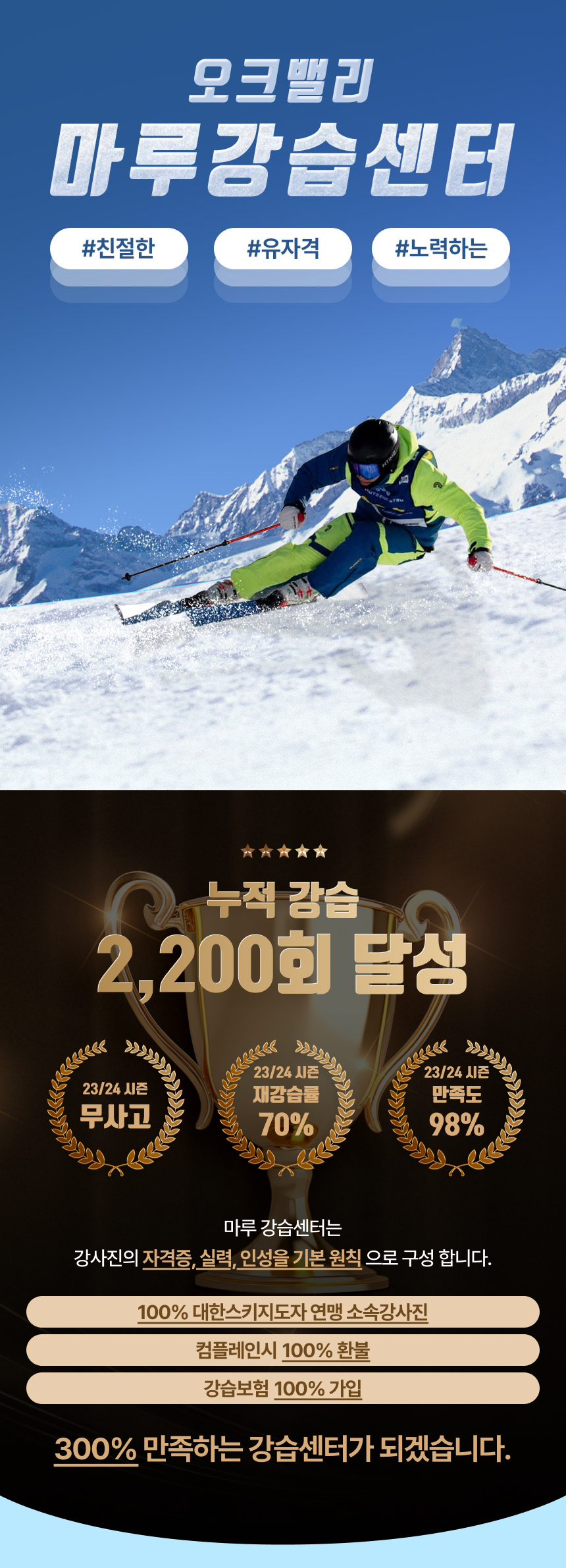 강습은 단계별로 세분화되어 있어요. 스키를 처음 신어보는 기초반부터, 속도를 즐기기 시작한 초급반, 자신감을 얻어 슬로프를 넓게 즐기는 중급반, 시합반과 자격증 대비반까지! 누구나 자신의 실력과 목표에 맞게 선택할 수 있어, 처음 와도 자연스럽게 레벨업되는 과정이 매력적이에요. 강습의 핵심은 대한스키지도자연맹 소속 강사진이라는 점입니다. 믿을 수 있는 지도자들과 함께라면 안전과 실력, 두 가지를 모두 채울 수 있어요! 무엇보다 강습 컴플레인 시 100% 환불 정책은 확실한 자신감을 보여줍니다. 퀄리티에 대한 자부심이 없으면 말하기 어려운 조건이죠. 여기에 주 1회 서비스 마인드 수강, 리프트·렌탈·숙박 제휴 혜택까지 더해져 전체 경험이 더 풍부해집니다.
