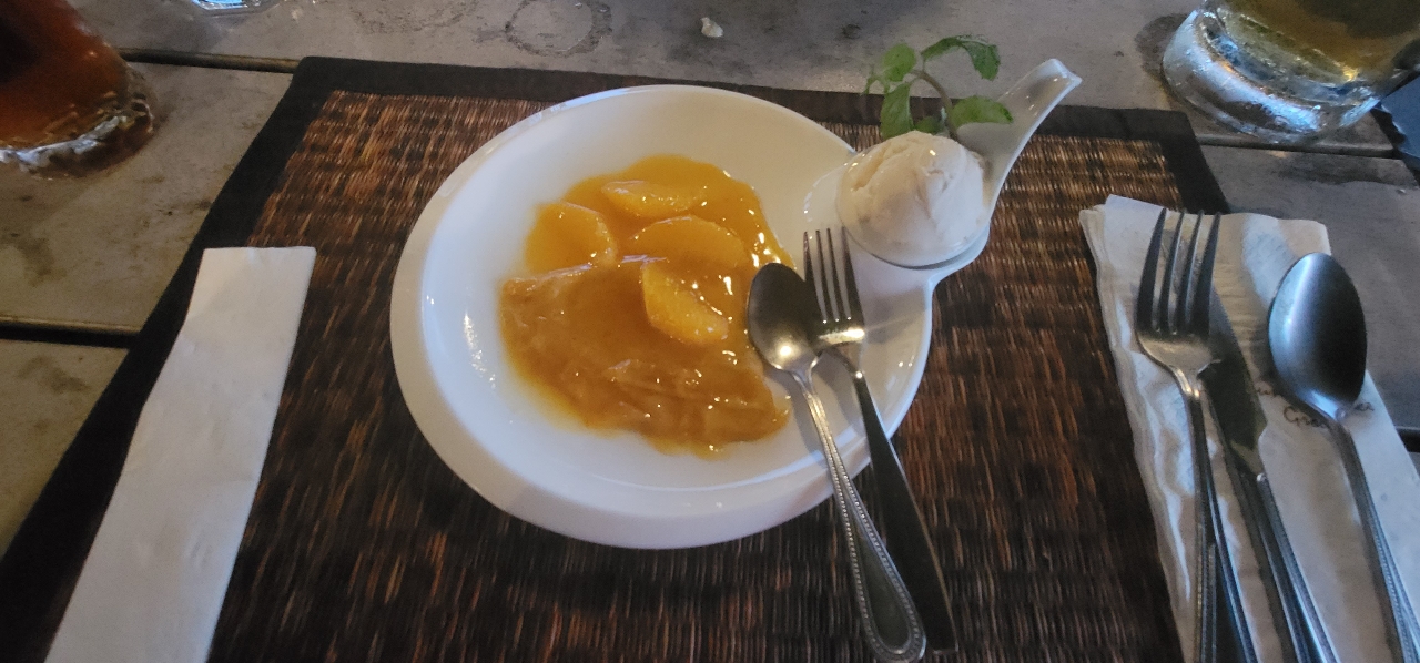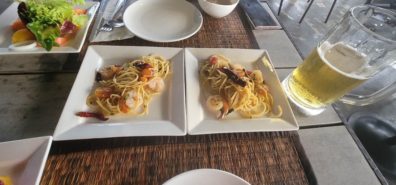 메인 (둘 중 한 가지 선택) : 팟타이 꿍(새우 팟타이) 또는 팟플라오완빠까퐁 (바질과 볶은 농어와 흰쌀밥)