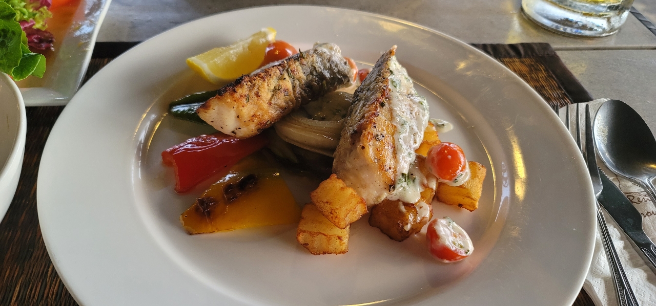메인 (둘 중 한 가지 선택) : 레몬 화이트 크림소스 구운 농어 또는 호주산 소고기 스테이크