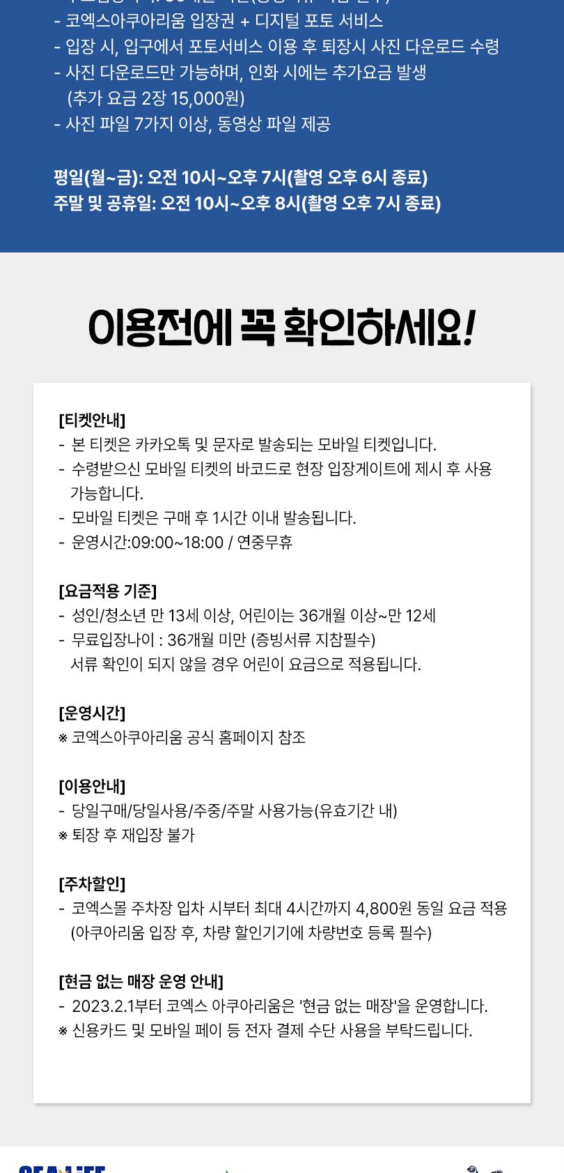 자연, 환경, 사람의 조화를 통한 독창적인 콘텐츠로 365일 언제나 즐거움이 가득한 곳, 코엑스 아쿠아리움에서는 17종 110여 마리의 상어를 만날 수 있어요. 희귀 멸종 위기종인 바닷속 전설의 인어, 매너티도 만나보세요.또한, 코엑스 아쿠아리움은 16개의 테마로 구성된 테마존 체험이 다양하게 마련되어 있으니 지루하지 않고 곳곳에서 아름다운 인생샷도 남길 수 있어요. 지금 바로 코엑스 아쿠아리움에 방문해 보세요.