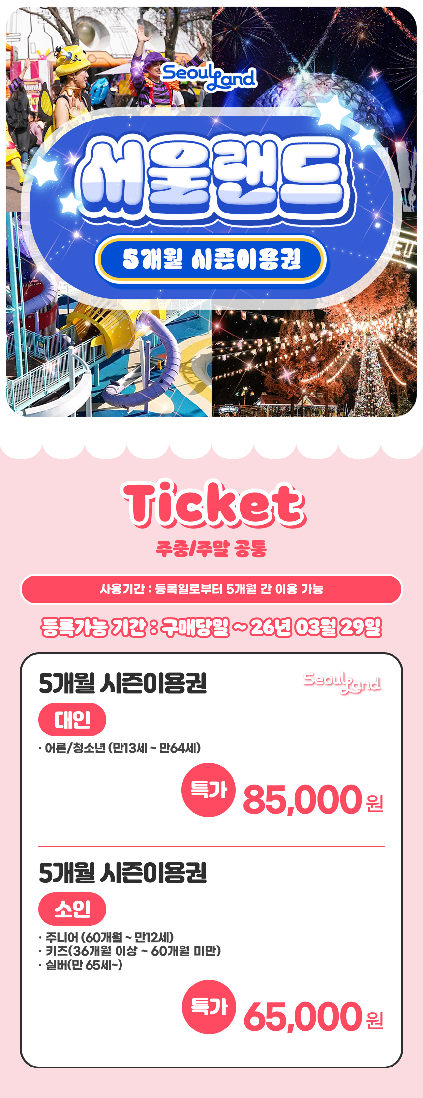 한국어 제공❣️서울랜드 5개월 시즌 이용권 특가! 합리적인 금액으로 구매하세요! 선착순 특가로 조기 마감될 수 있으니 서둘러 구매하시길 추천해요! ❣️ - 판매 기간 : 2026.02.21 ~ 2026.02.25 - 유효기간(정보등록기간) : 구매 당일 ~ 2026.03.29