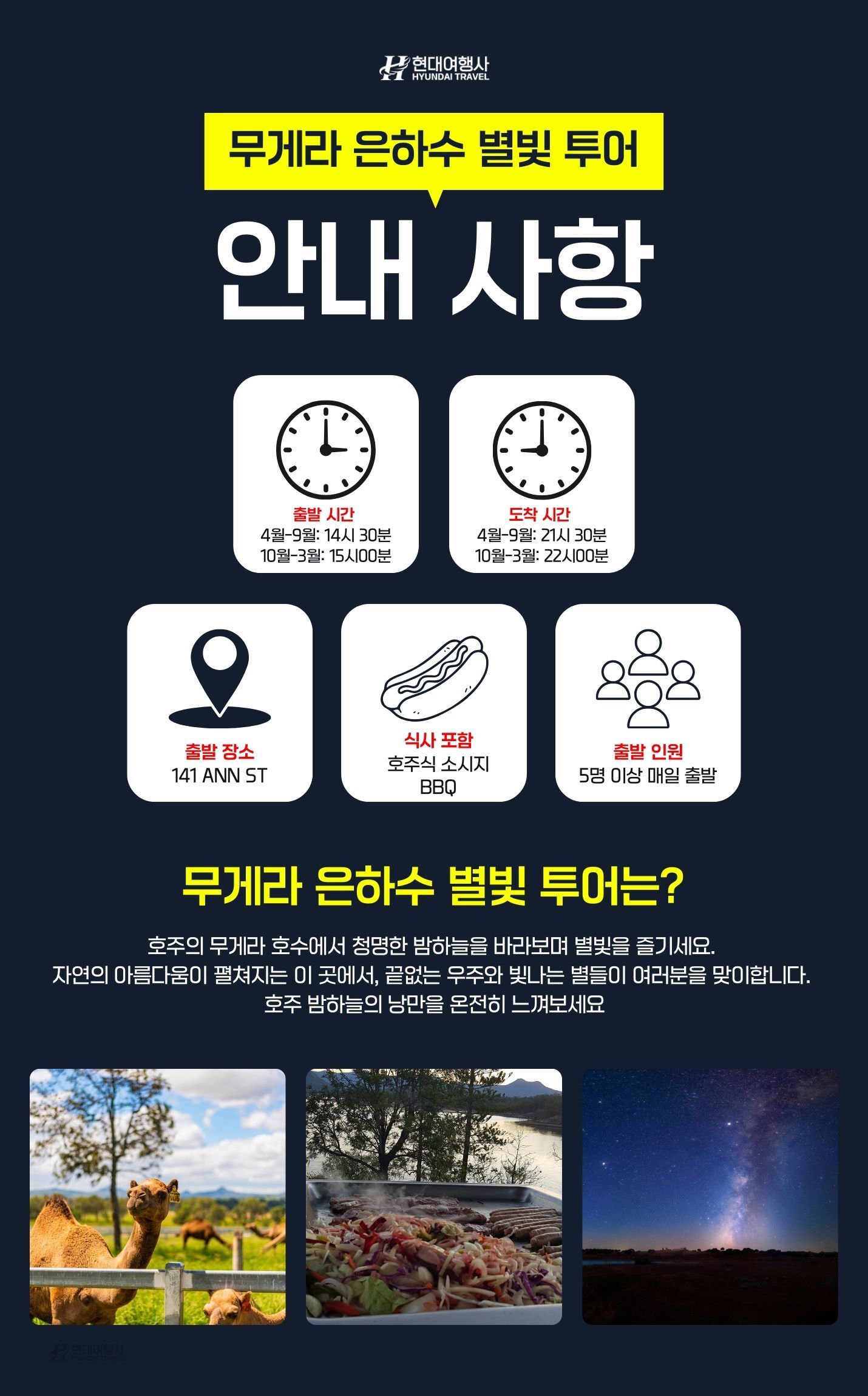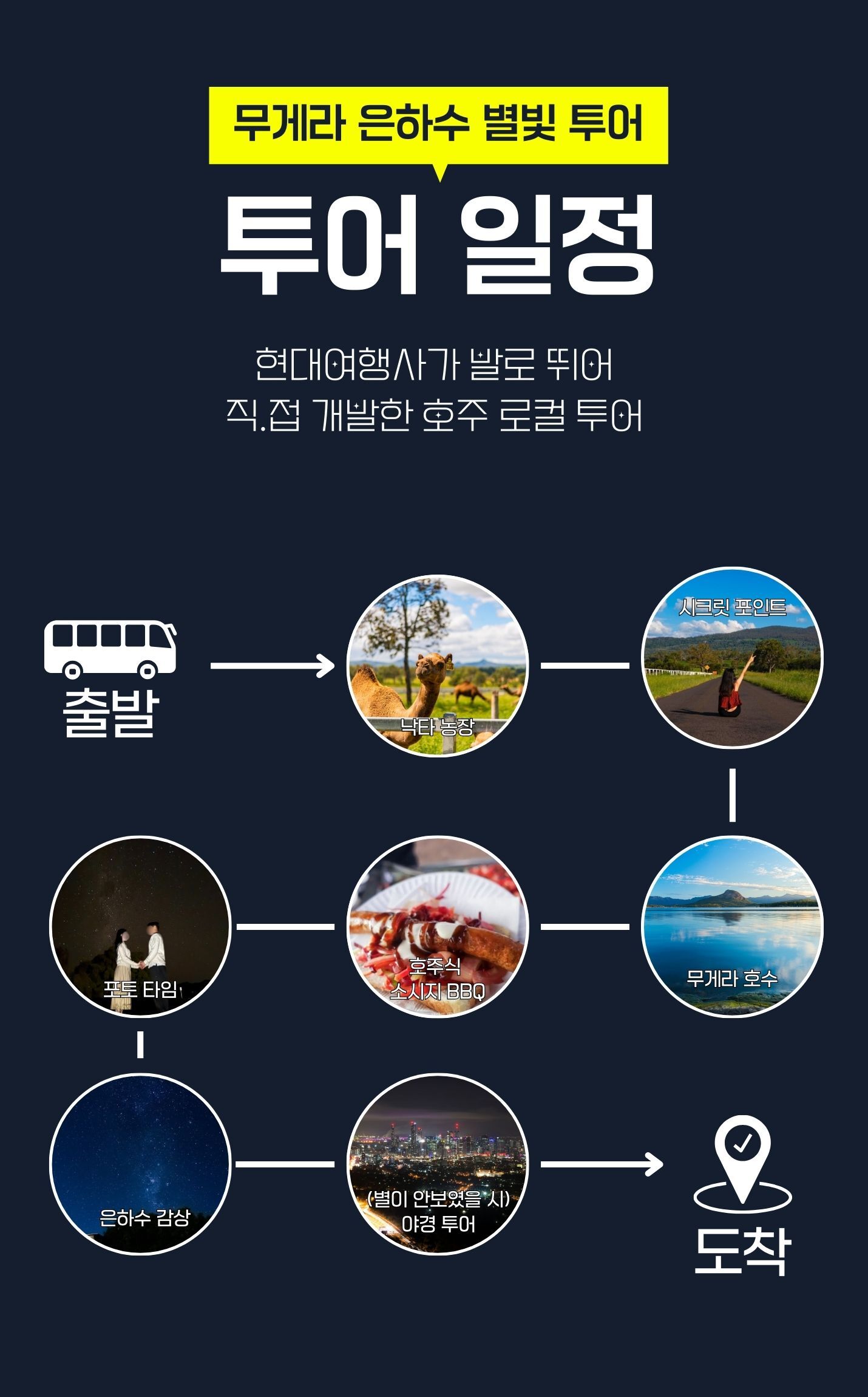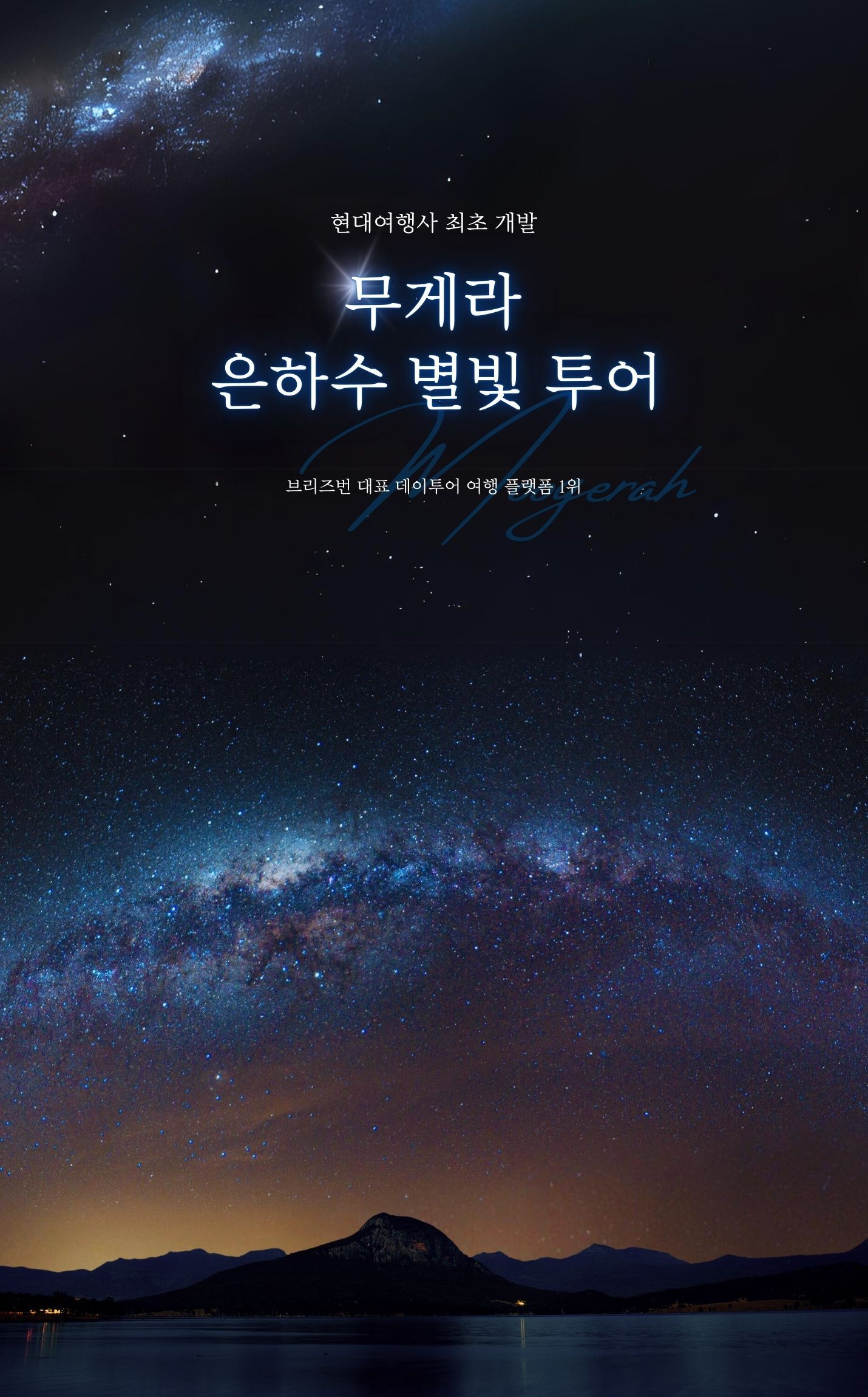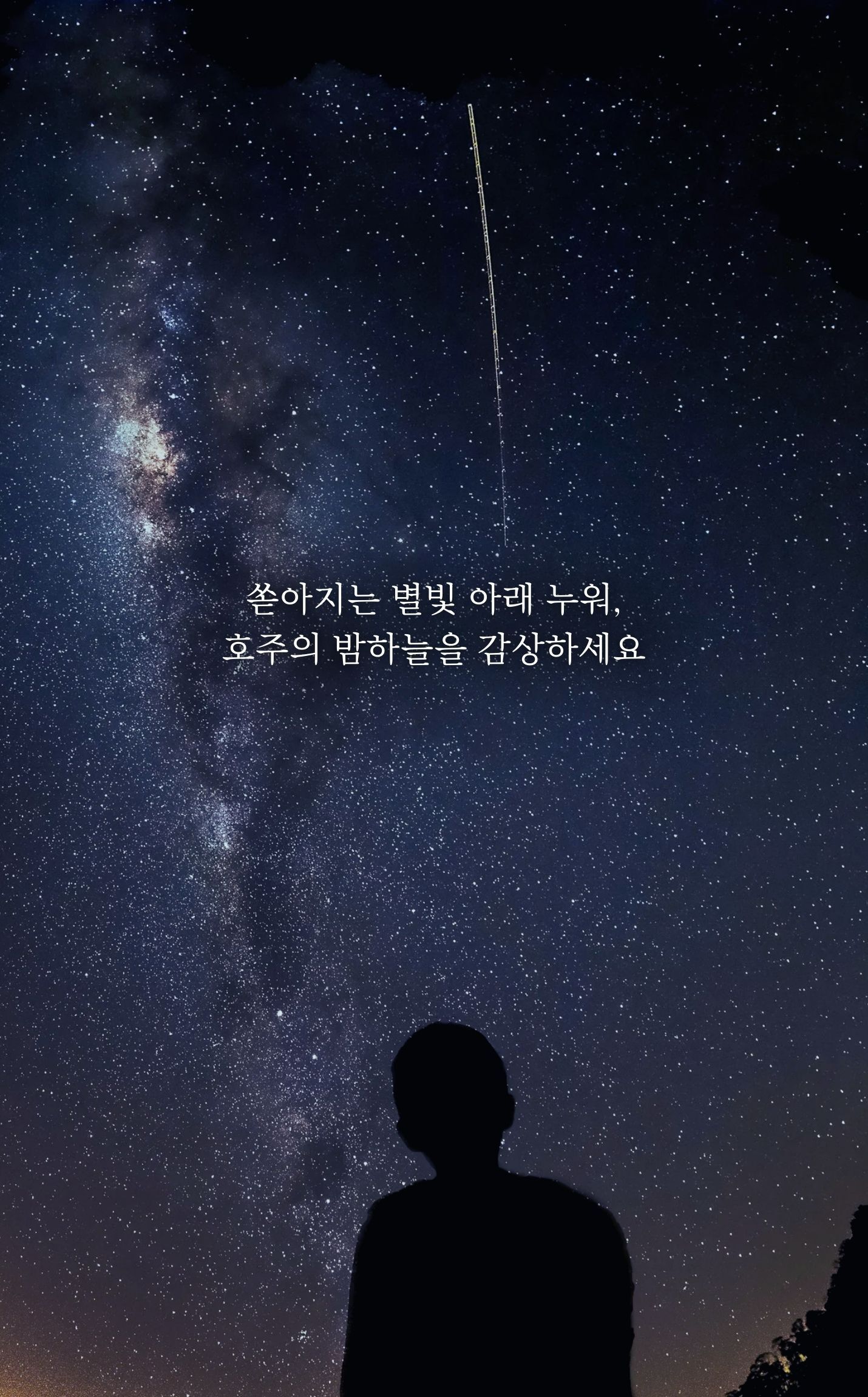 쏟아지는 듯한 아름다운 은하수 아래에서 잊지 못할 낭만적인 시간을 선사해 드릴 거예요. 한국에서는 쉽게 마주할 수 없는 황홀한 밤하늘의 별빛을 감상하며, 일상의 스트레스를 잊고 자연의 경이로움에 흠뻑 빠져보세요. 해가 질 무렵, 잔잔한 무게라 호숫가를 따라 여유롭게 산책하며 아름다운 자연 풍경을 눈에 담는 것으로 투어는 시작돼요. 저녁식사로 호주식 소시지 BBQ까지 즐긴 뒤, 서서히 어둠이 내리고 밤하늘이 모습을 드러내면, 수많은 별들이 쏟아져 내리는 듯한 환상적인 광경이 펼쳐진답니다. 사랑하는 사람과 함께, 혹은 혼자만의 시간을 가지며 밤하늘의 아름다움을 만끽하는 특별한 추억을 만들어 보세요.