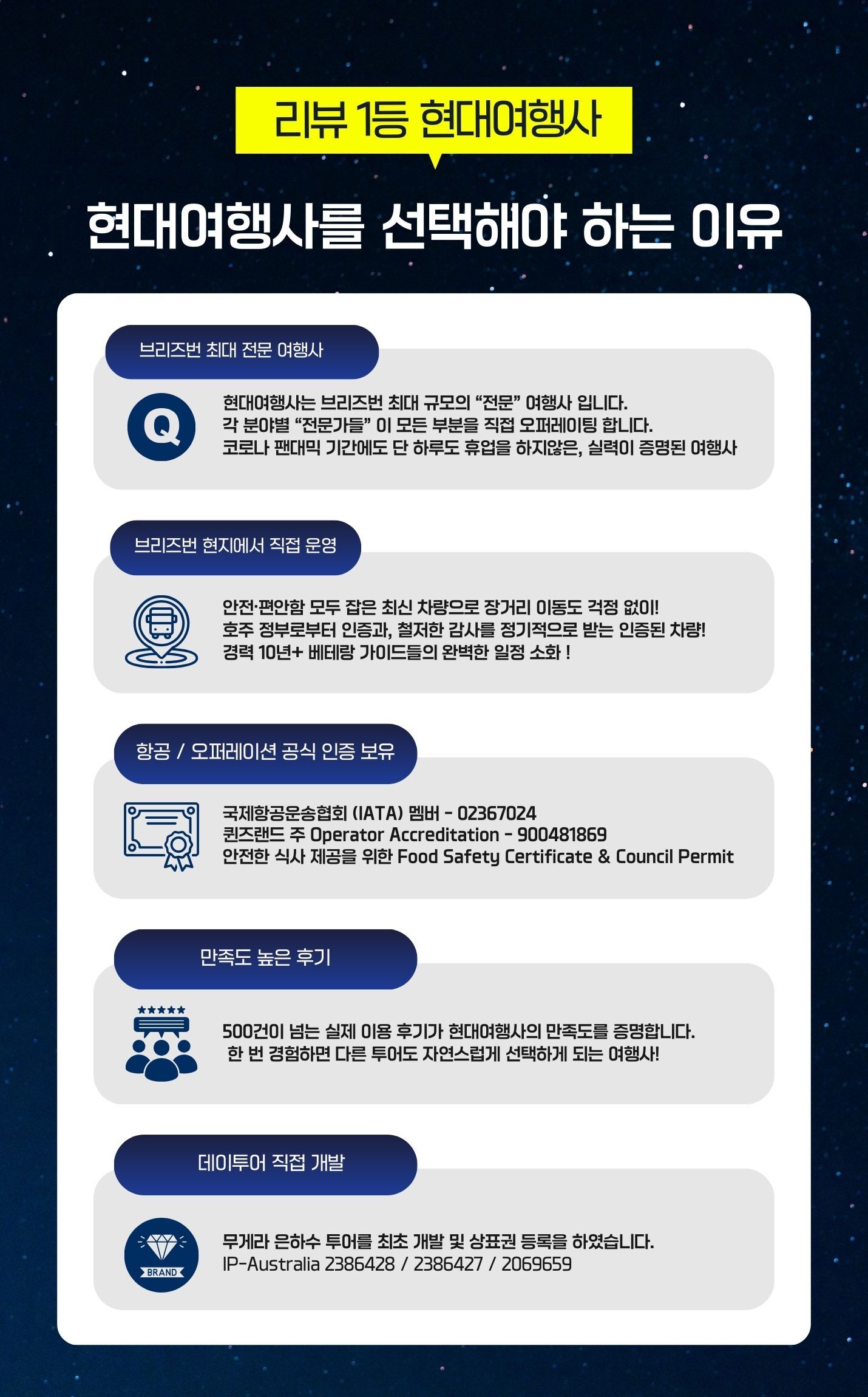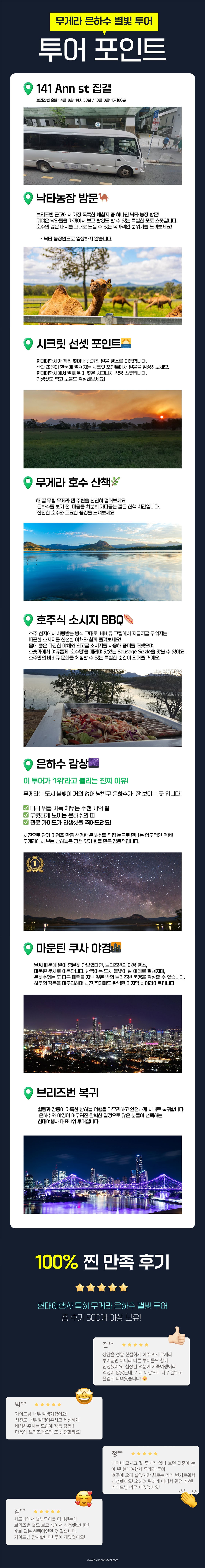 베스트이영애 가이드님 덕분에 잘 다녀왔습니다!! 별도 충분히 봤는데 하나라도 더 보여주시려고 마운틴쿠사도 가주시고 좋았어요 ㅎㅎ 그리고 마지막에 또 다른 야경 포인트도 알려주셔서 잘 봤습니다. 브리즈번 온다면 무게라 투어 꼭 강추입니다! 전 혼자 갔는데도 가이드님들이 사진 잘 찍어주셨어요~ 혼자 여행온다면 꼭 오세요!! 그리고 꼭 밝은색 옷 입고 가세요,,,