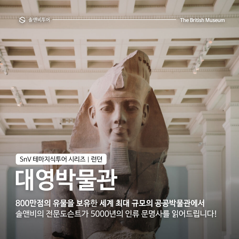 유물로 역사를 말하는 곳 박물관! 그 중에서도 세계 최고의 컬렉션을 자랑하는 대영박물관에서 '솔앤비 박물관 전문 가이드와 함께', 영국공인가이드협회 선정 대표 유물들을 둘러보며 5000년 세계사를 눈과 귀로 읽어봅니다. 솔앤비 박물관 투어는 인류역사의 다양한 순간과 그들의 문화와 세계관, 사회상 및 일상의 모습으로 인류문명의 발자취를 탐험해보고, 지금 우리가 살고 있는 삶과 인생을 되돌아 보는 뜻깊고 유익한 투어입니다.