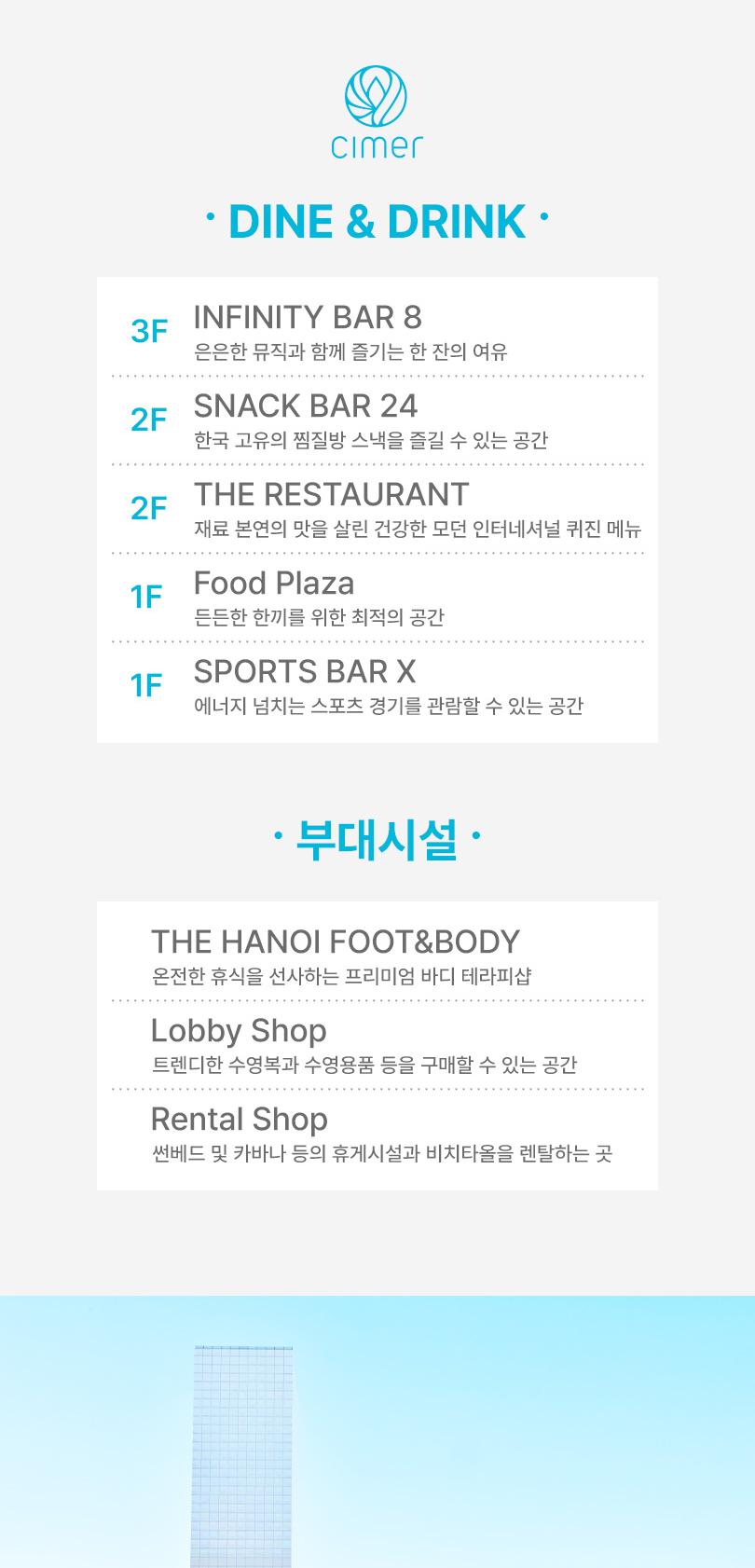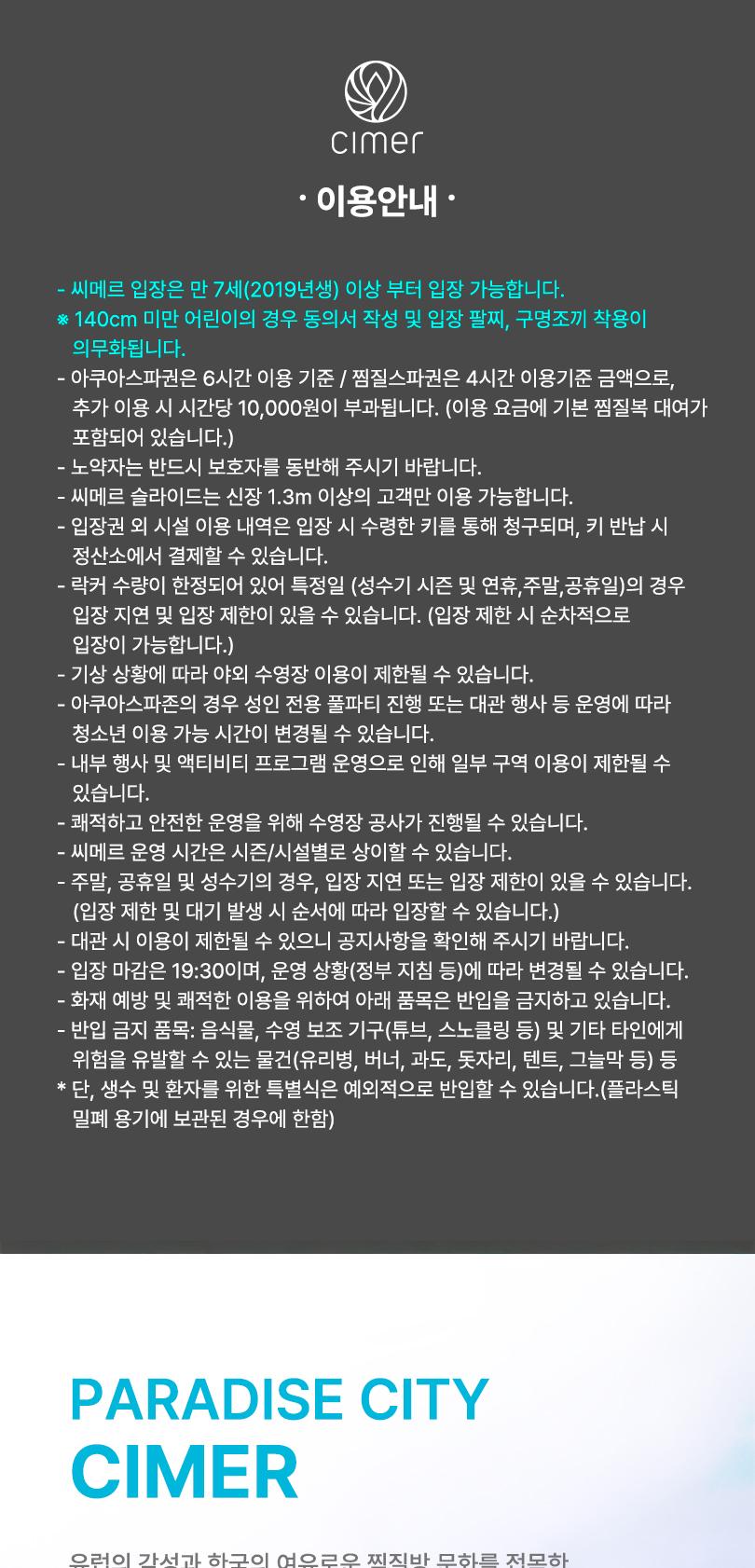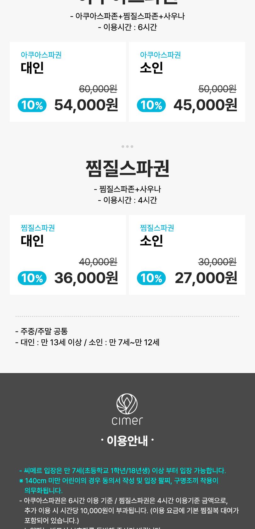 씨메르는 외국 느낌 물씬 나는 수영부터 풀파티, 짜릿한 워터슬라이드는 물론, 낭만 가득한 석양을 즐길 수 있는 인피니티 풀이 있는 아쿠아스파와 한국 고유의 찜질 스파에서 여유를 즐기며 특별한 하루를 보낼 수 있는 공간이에요. 해당 티켓과 함께라면 할인된 가격에 씨메르의 전 시설을 이용할 수 있으니 씨메르에서 진정한 휴식을 즐겨보세요.