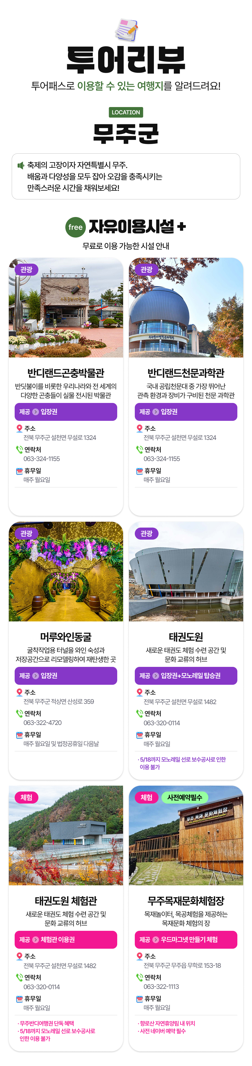 전북 투어패스와 함께, 무주의 반디까지! 한장의 카드로 36시간 동안, 무주 자유이용시설이 가능해요. 반디랜드, 머루와인동굴, 무주 산골영화관, 무주 태권도원 모노레일 등 인기 관광지도 만날 수 있어요.