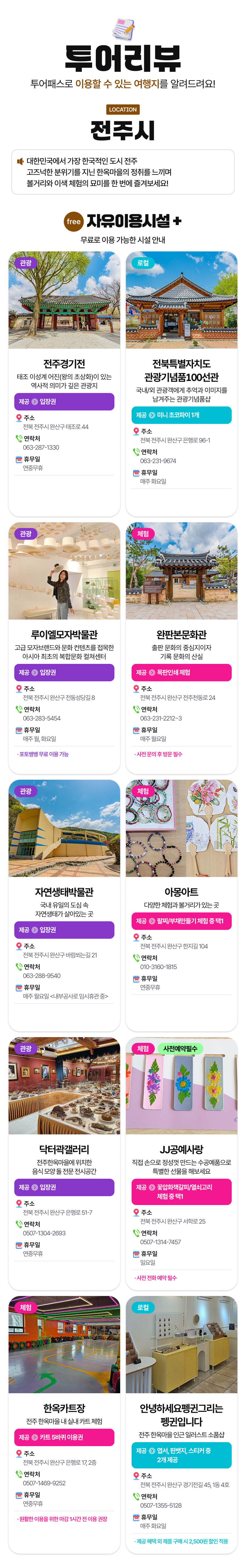 전북 투어패스 중 전주한옥마을 이용시설들을 모아 놓은 사용자 평점 5점 만점에 4.9점을 받은 인증된 갓성비 투어패스예요. 조선시대에 지어진 아름다운 전통 전각과 여러 박물관 무료입장부터 향긋한 커피와 달달한 디저트가 있는 핫플 카페까지 전주 한옥마을 필수 코스를 24시간 동안 알차게 즐길 수 있어요. 무료로 이용 가능한 자유이용시설부터 할인혜택을 제공하는 특별할인가맹점까지 투어패스와 함께라면 꽉 찬 하루를 즐길 수 있을 거예요. 지금 바로 전주한옥마을 투어패스와 함께 떠나보세요.