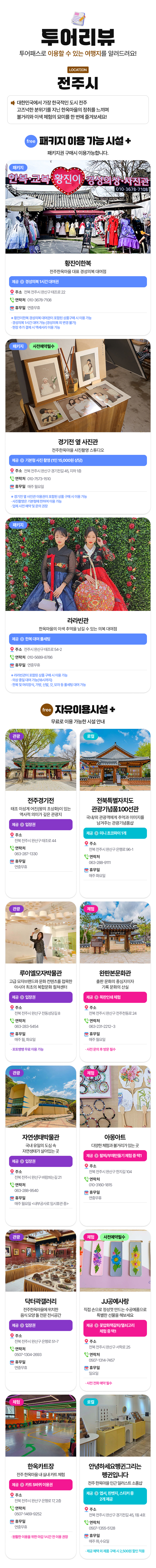 한 장의 카드로 전주한옥마을 완전 정복! 24시간 동안, 전주와 전주한옥마을의 인기 여행지를 무료로 입장할 수 있어요. 모바일 티켓으로 전주 한옥마을 내 관광지 7곳과 한복대여, 경성의복대여, 사진촬영까지!