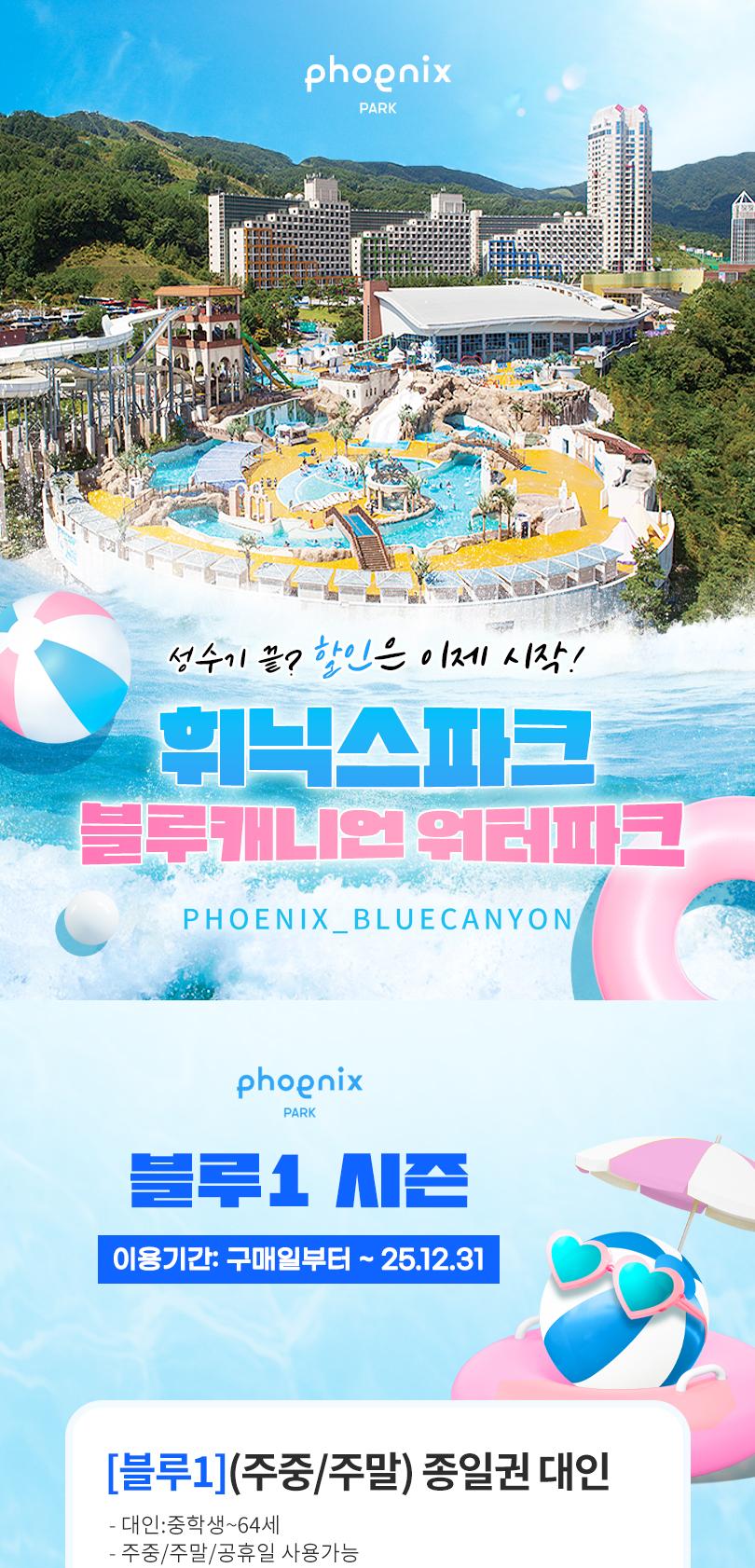강원도 평창 휘닉스파크 블루캐니언 워터파크는 지중해 감성을 담은 프리미엄 워터파크에요. 지하 700m에서 끌어올린 천연 광천수를 사용하는 실내존에는 파도풀과 유수풀, 바데풀과 유아풀까지 갖춰져 있어 사계절 내내 날씨 걱정 없이 안전하고 쾌적한 물놀이를 즐길 수 있어요. 실외존으로 나가면 한국 최초의 업힐 슬라이드와 140m 스피드 슬라이드, 가족이 함께 즐기는 패밀리 슬라이드 등 짜릿한 어트랙션이 기다리고 있으며, 국내 최장 201m 웨이브 리버에서는 색다른 스릴을 만끽할 수 있답니다. 물놀이 후에는 반신욕탕과 이벤트 스파에서 피로를 풀고, 푸드코트와 간식 코너에서 든든하게 식사와 간식을 즐기며 여유로운 시간을 보내보세요!