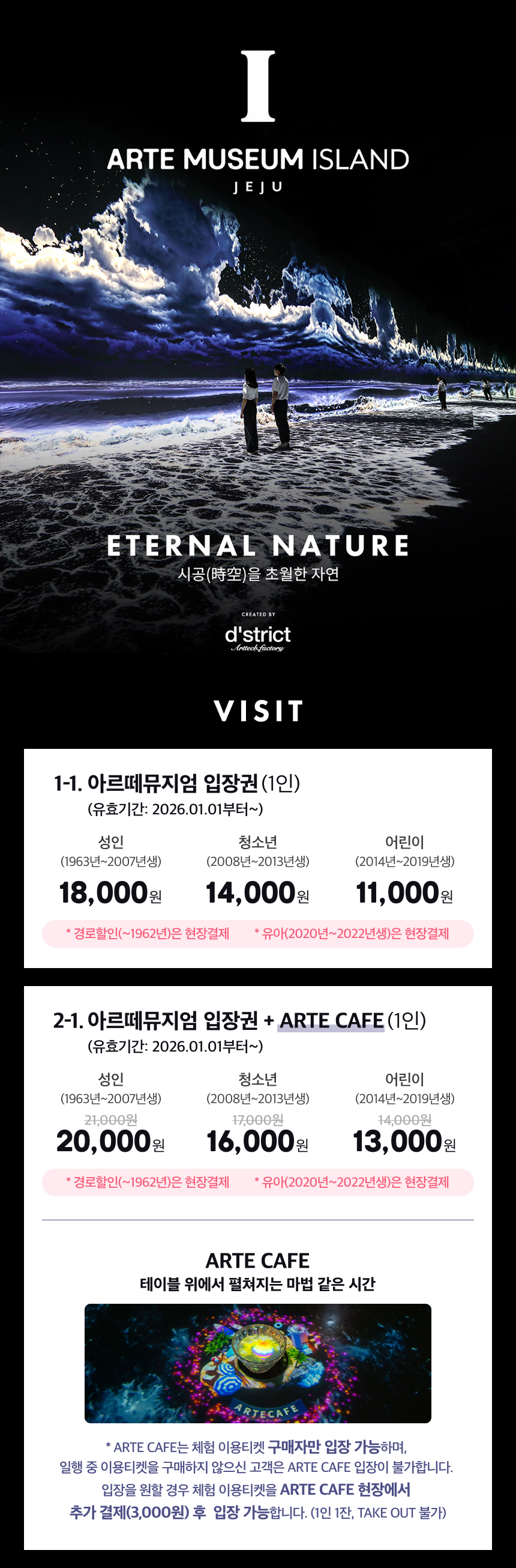 국내 최대 몰입형 미디어 아트 전시관 아르떼뮤지엄을 아시나요? 면적 1,400평, 최대 10M 높이에 육박하는 웅장한 공간에서의 다채로운 미디어 아트를 경험할 수 있는 곳으로 영원한 자연을 소재로 시각적 강렬함과 더불어 사운드와 향기가 완벽한 몰입 경험을 제공해요.