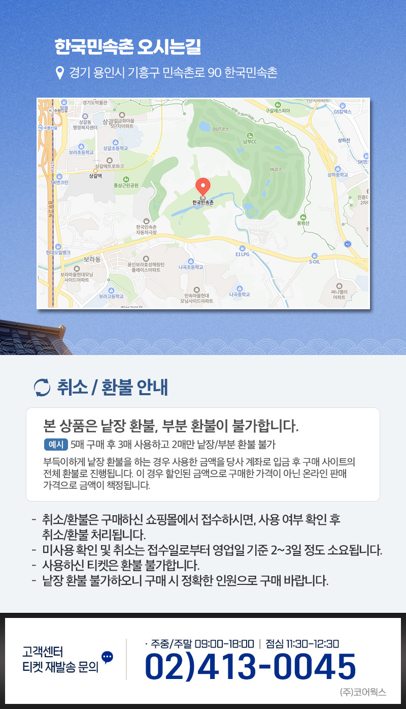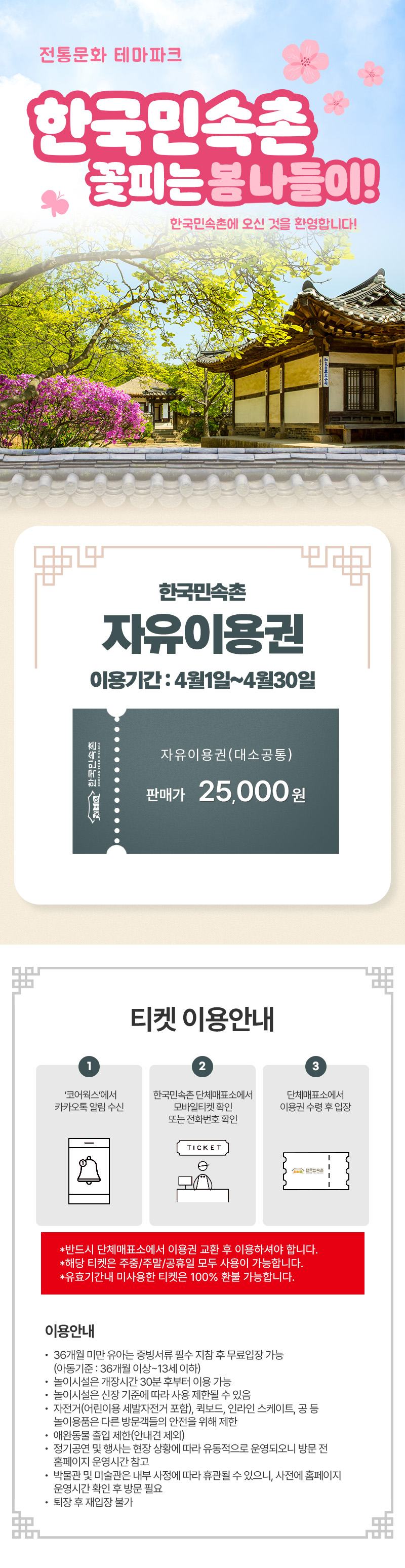 대한민국을 대표하는 전통문화 테마파크 한국민속촌. 전통문화 속의 가치와 즐거움을 새롭게 발견하고 즐기며 우리의 전통이 얼마나 아름답고 소중한지 공감할 수 있는 곳. 선조들의 지혜와 슬기를 체험할 수 있는 국내 유일의 전통문화 테마파크 한국민속촌으로 초대합니다!