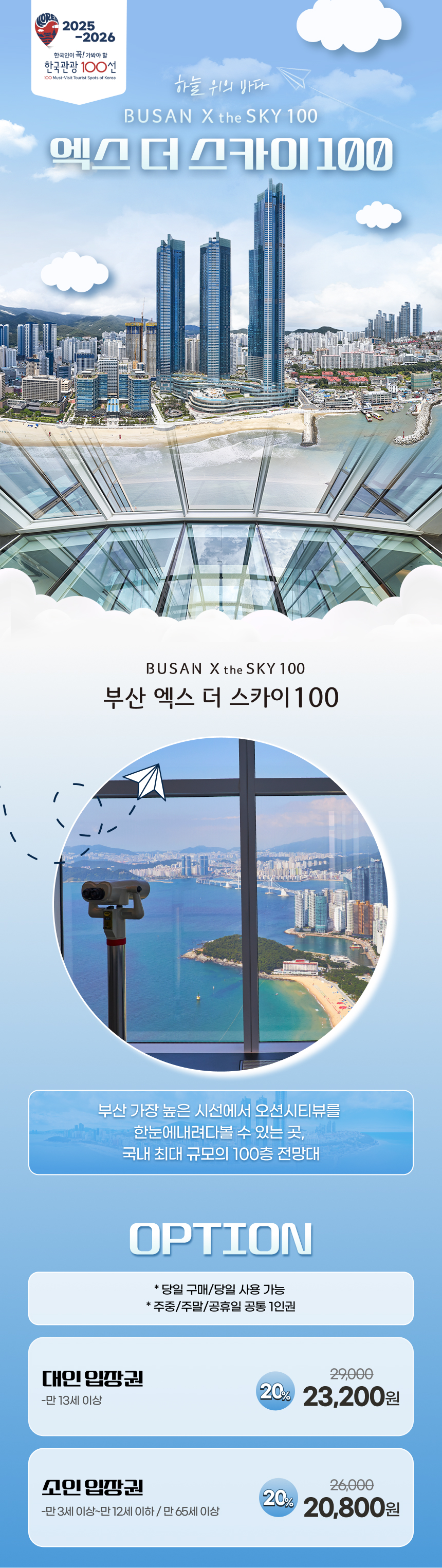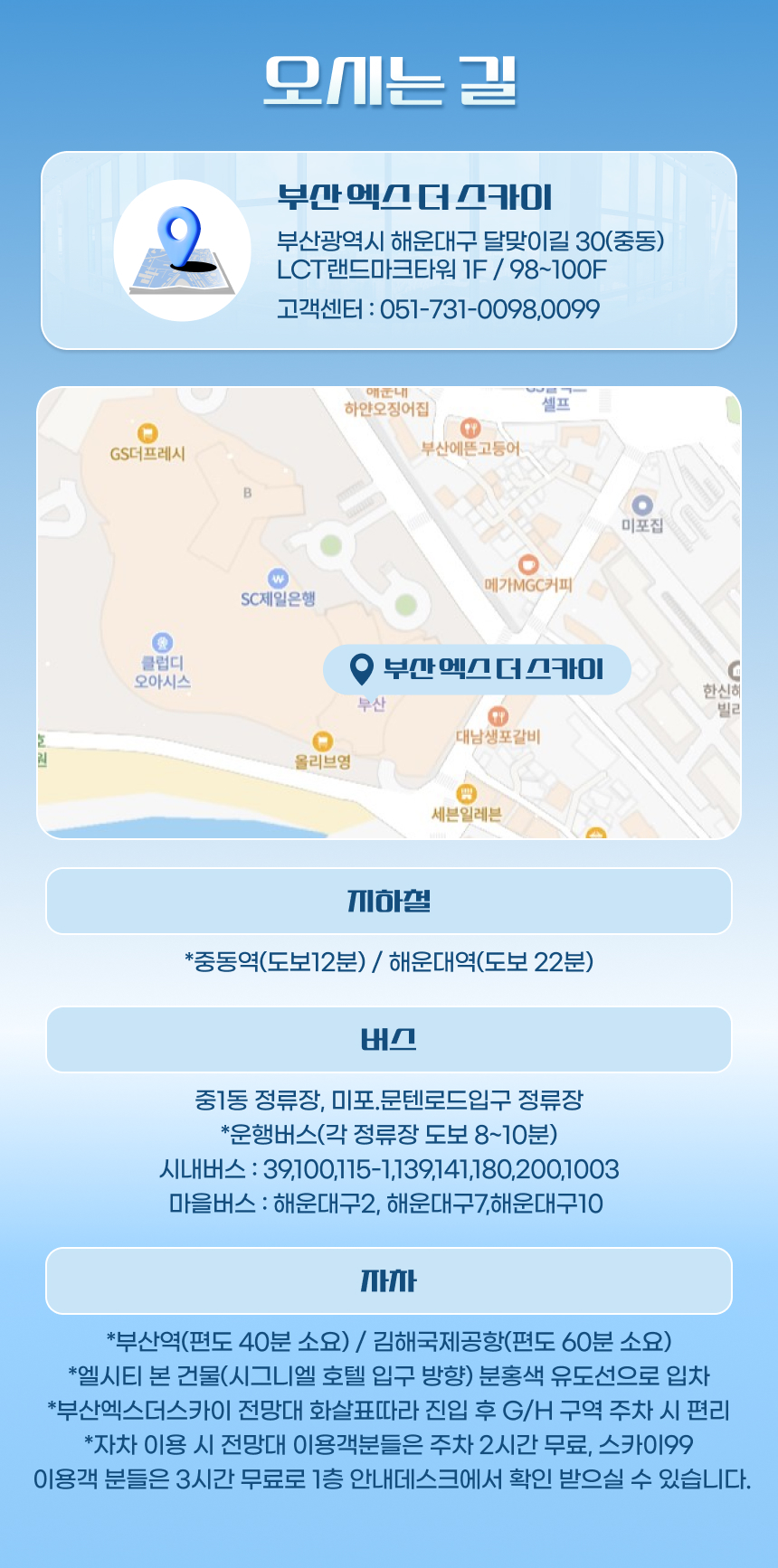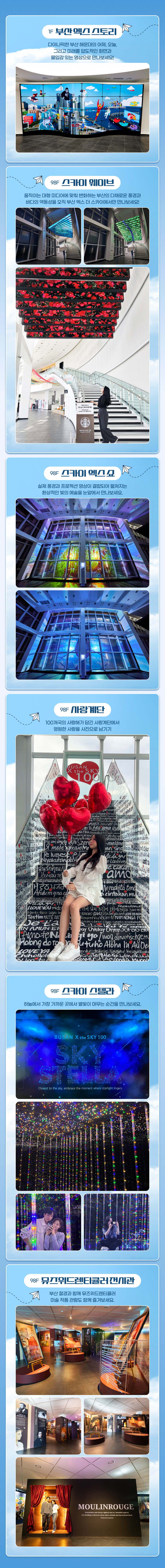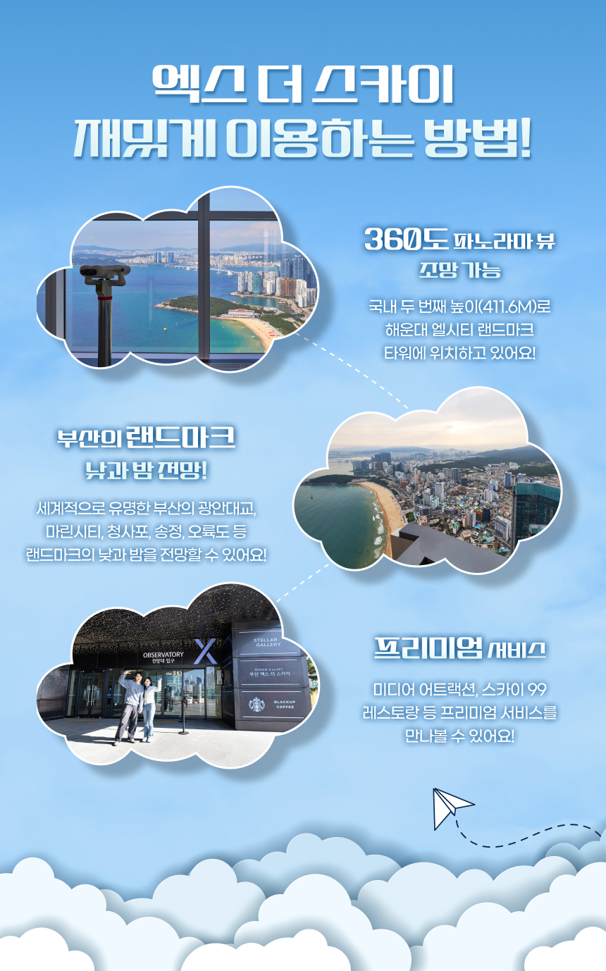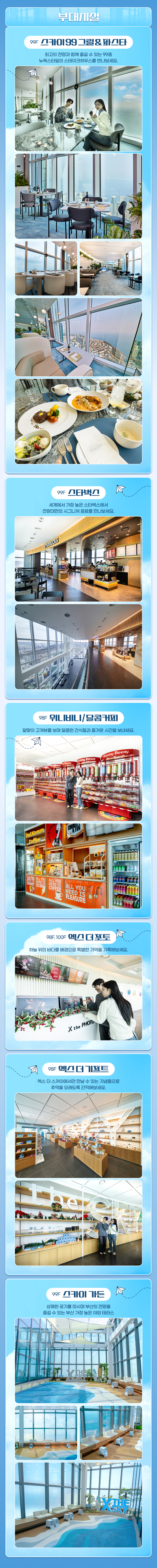 부산의 새로운 명소! 해운대 엘시티 최고층에 있는 전망대를 방문해 보세요. 층당 350평의 넓은 면적으로 이루어져 있어 여유롭게 즐길 수 있으며, 한국에서 두 번째로 높은 엘시티 랜드마크 타워를 경험할 수 있어요. 해운대의 아름다운 백사장과 부산의 멋진 시티뷰와 함께 멋진 사진을 찍어보세요! 전망대 내부의 화려한 미디어 파사드, 최고의 서비스를 제공하는 라운지 카페, 심플하게 즐기는 캐쥬얼 카페까지 즐길 수 있어요!