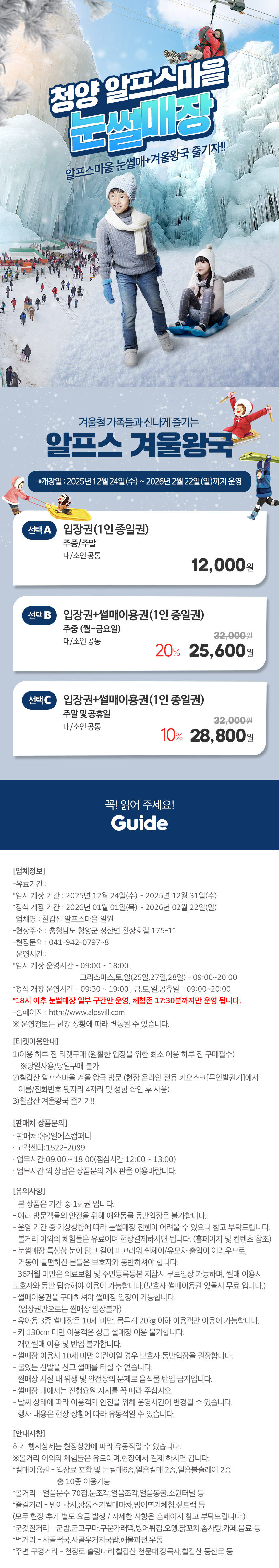 충청남도 청양에 위치한 알프스마을에서 멋진 겨울의 추억을 만들어 봐요. 커다란 얼음 분수가 만들어 놓은 알프스 겨울 왕국이에요. 짜릿한 눈썰매장과 얼음 조각 등 다양한 놀거리와 볼거리가 가득해요. 그리고 야간에만 볼 수 있는 별빛으로 물들어 있어요.