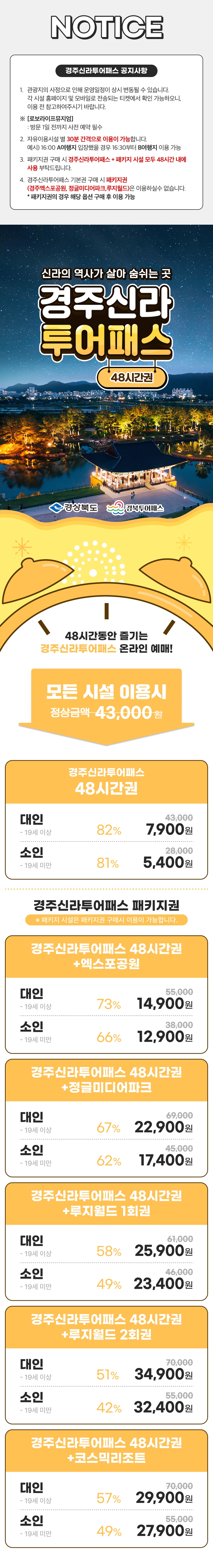 해당 티켓은 경주뿐만 아니라 경주 주변의 영천, 포항까지 제휴처가 있어 관광지, 유적, 음식점, 카페, 체험시설 등 다양한 곳에서의 무료 또는 할인 혜택을 받을 수 있는 티켓으로 해당 티켓과 함께 여행하면 누구보다 알차고 가성비 있는 여행이 가능해요. 또한 패키지 티켓은 경주의 필수코스인 엑스포대공원, 루지월드, 정글미디어파크까지 이용이 가능해 해당 시설을 이용할 예정이었던 분들에게 더욱 추천하는 투어패스예요.