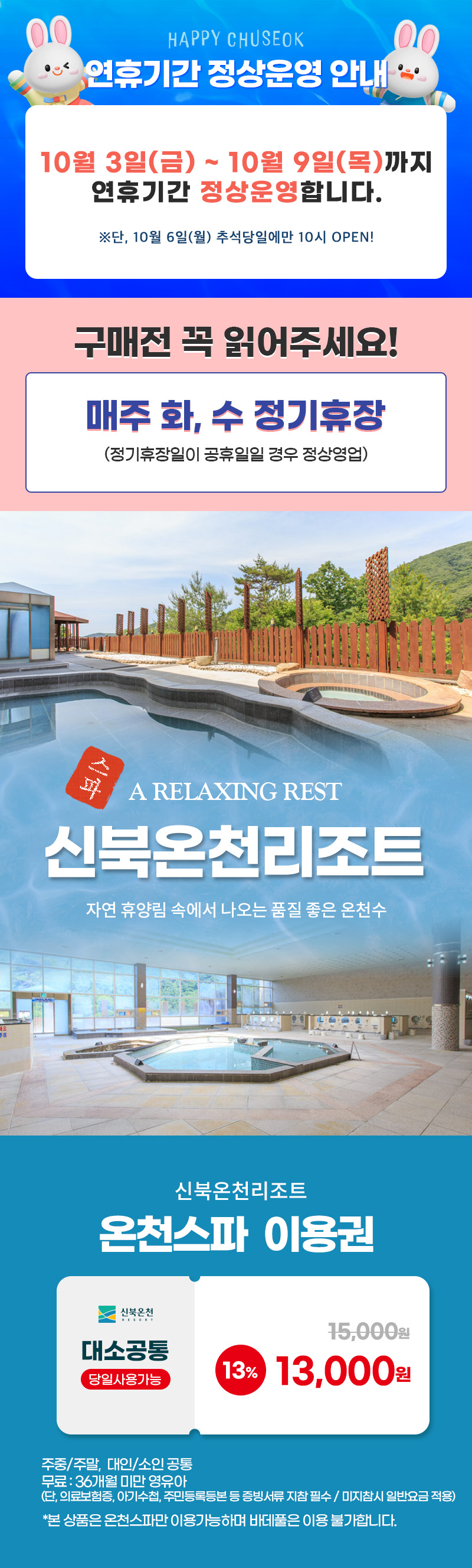 * 이용시간은 영업상황에 따라 변동될 수 있으니 이용 전 신북온천 홈페이지 확인 바랍니다.