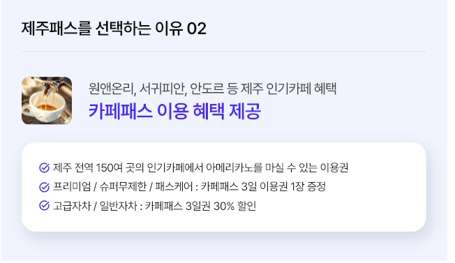 제주패스는 달라요! 제주패스는 완전자차(고급자차) 보다 더 넓은 범위를 보장해줘요! 안심하고 이용해보세요. 제주패스 이용자라면 제주도 핫플레이스 카페의 아메리카노를 무료로 이용할 수 있는 카페패스도 놓치지 마세요!