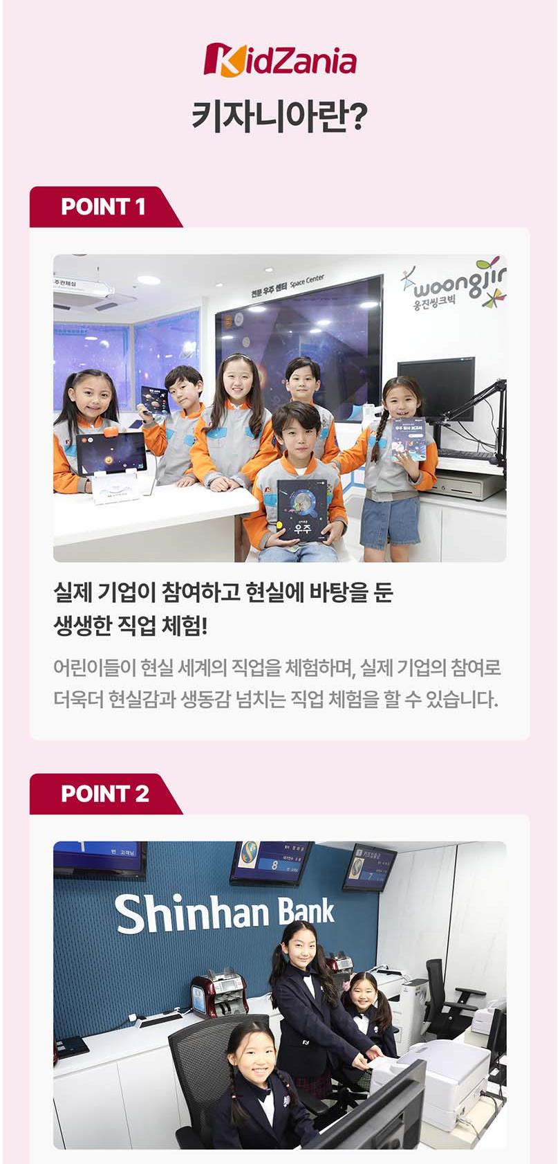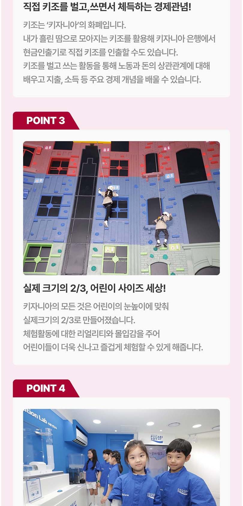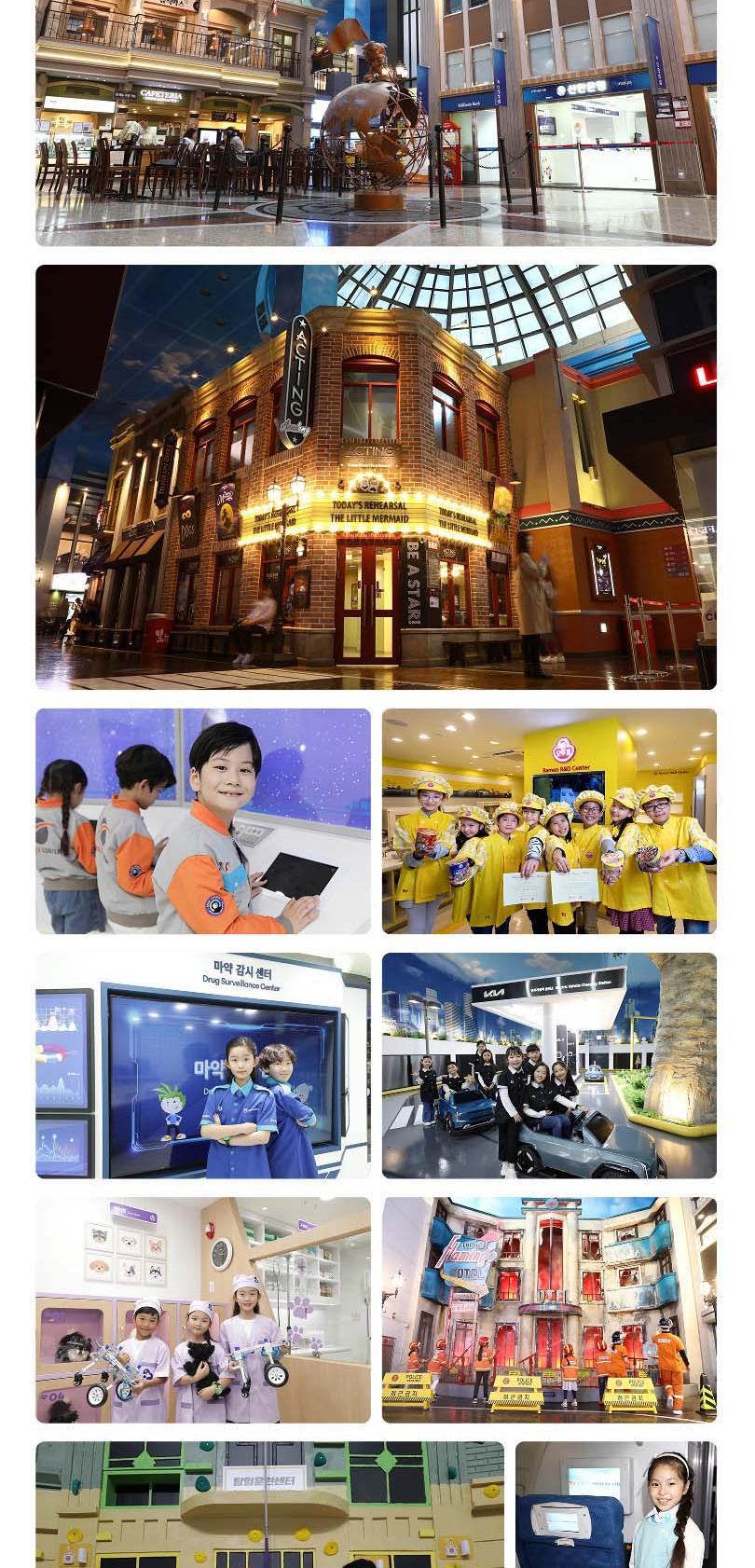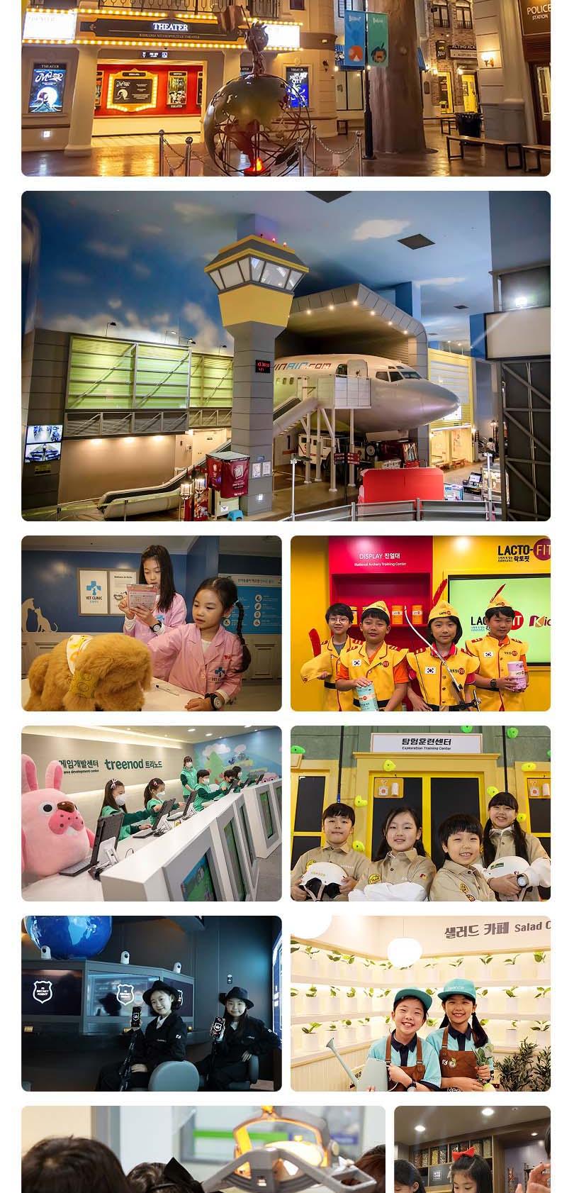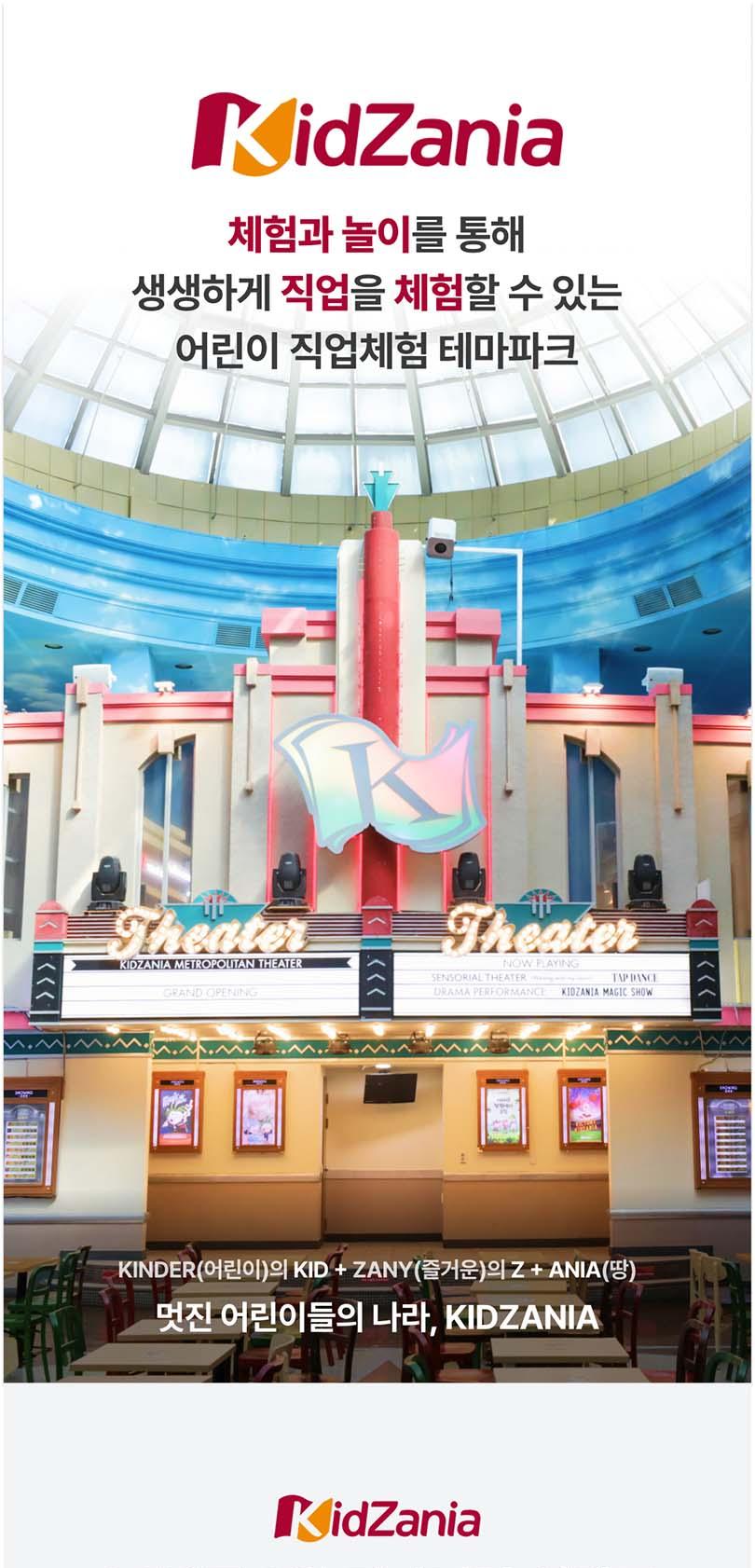 한창 꿈이 많은 아이들을 위한 세상, 160여 개의 직업을 체험해 볼 수 있는 국내 최대 규모의 직업체험 테마파크 키자니아에서 특별한 시간을 보내보세요. 키자니아에서는 실제 기업이 참여해 현실감 넘치는 다양한 직업체험을 통해 꿈을 키우고, 직접 키자니아의 화폐인 키조를 벌고 소비하며 경제관념도 배울 수 있어요. 소방관, TV 앵커, 경찰관 등 다양한 직업 체험을 다른 아이들과 어우러져 함께하기 때문에 배려심과 사회성을 키우고 리더십 또한 기를 수 있어 더욱 좋아요. 어린이의 눈높이에 맞춰 실제 크기의 2/3으로 만들어진 진짜 어린이들의 세상에 아이와 함께 방문해 보세요!