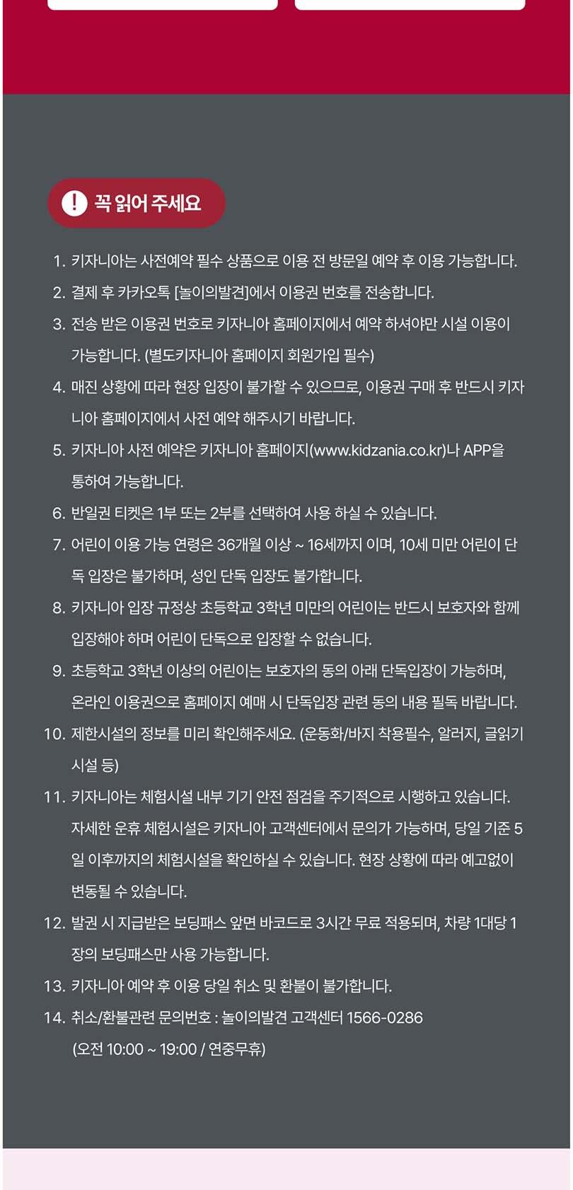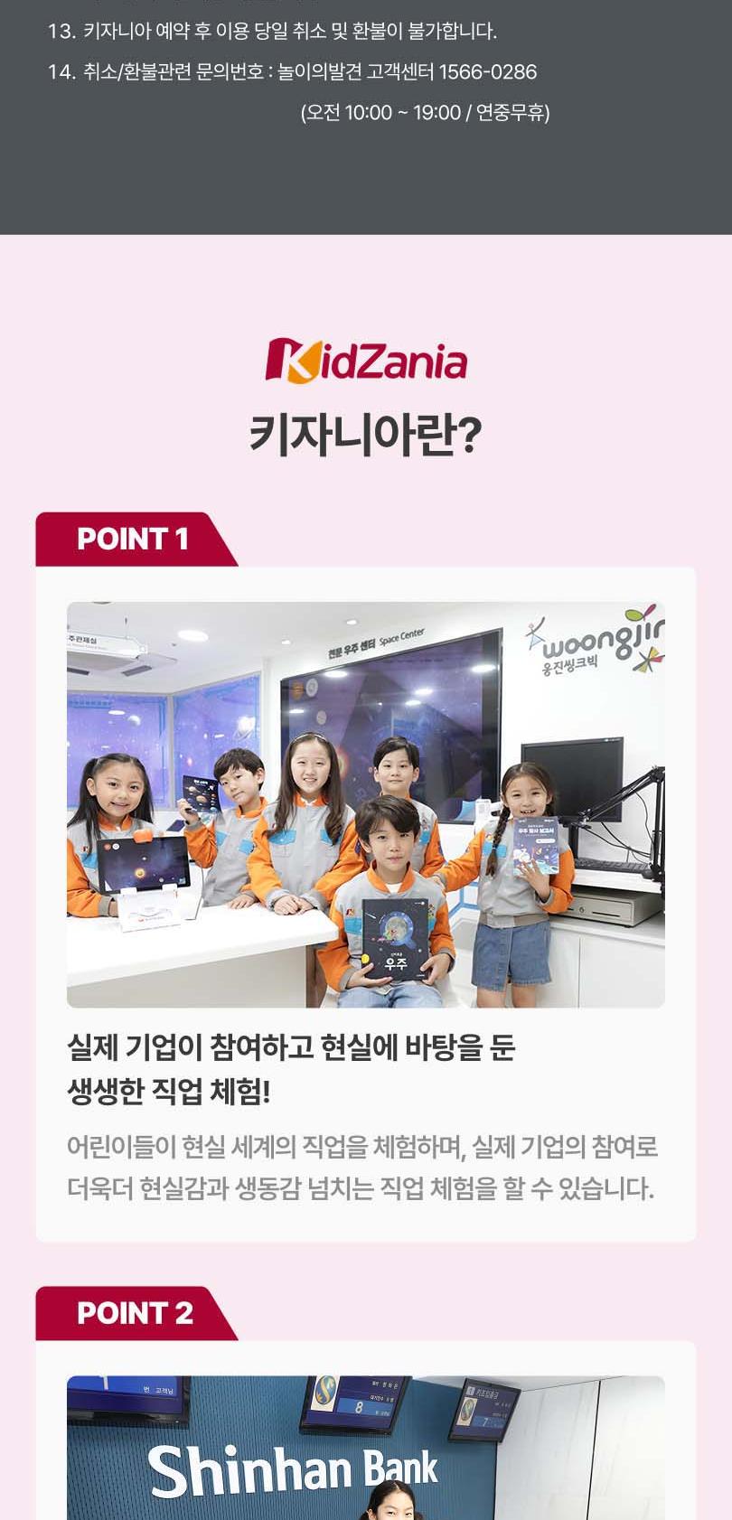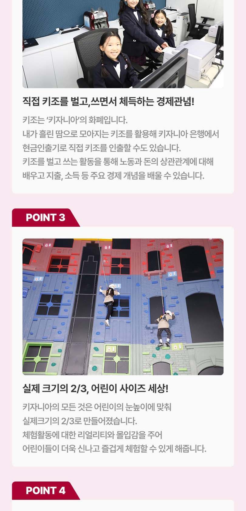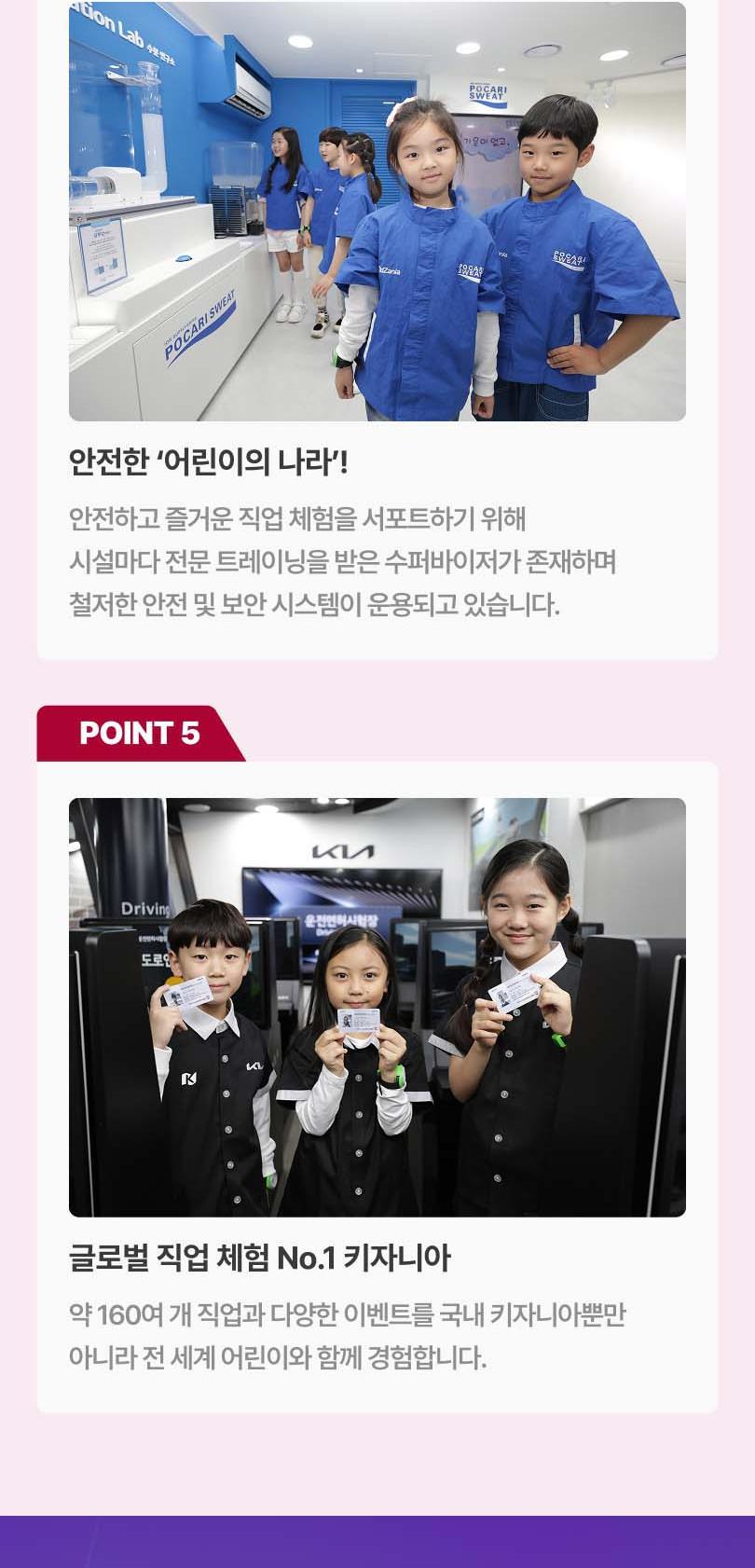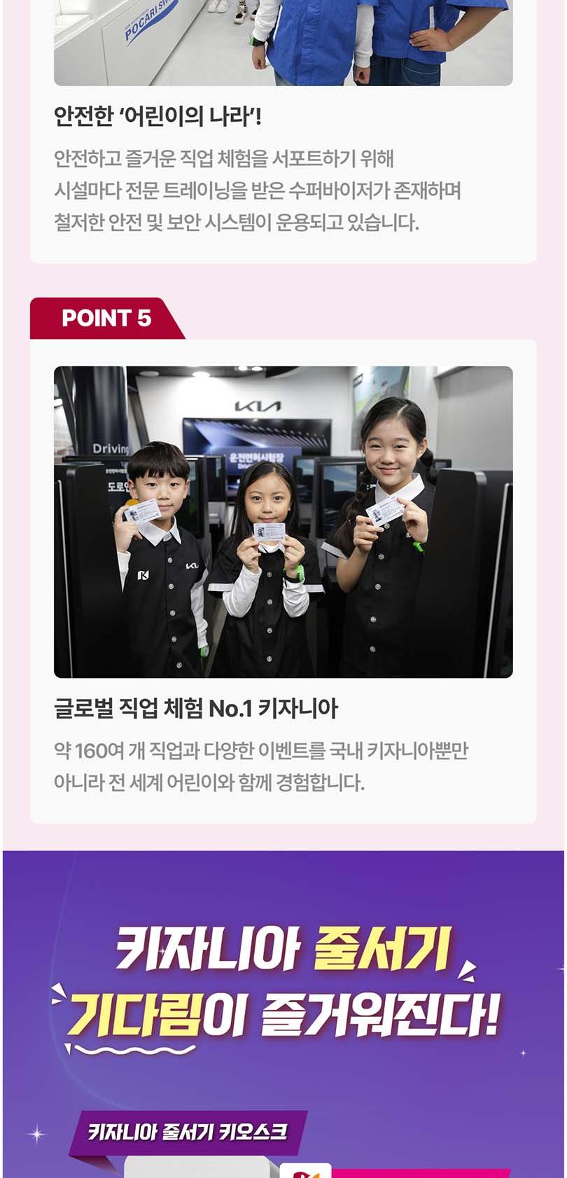 한창 꿈이 많은 아이들을 위한 세상, 160여 개의 직업을 체험해 볼 수 있는 국내 최대 규모의 직업체험 테마파크 키자니아에서 특별한 시간을 보내보세요. 키자니아에서는 실제 기업이 참여해 현실감 넘치는 다양한 직업체험을 통해 꿈을 키우고, 직접 키자니아의 화폐인 키조를 벌고 소비하며 경제관념도 배울 수 있어요. 소방관, TV 앵커, 경찰관 등 다양한 직업 체험을 다른 아이들과 어우러져 함께하기 때문에 배려심과 사회성을 키우고 리더십 또한 기를 수 있어 더욱 좋아요. 어린이의 눈높이에 맞춰 실제 크기의 2/3으로 만들어진 진짜 어린이들의 세상에 아이와 함께 방문해 보세요!