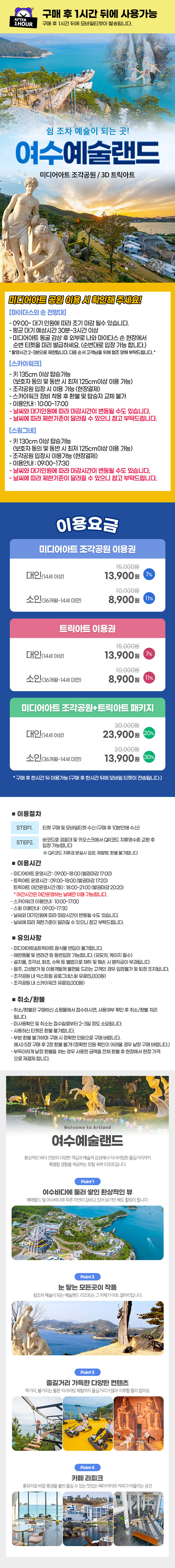 여수시 돌산읍에 위치한 복합 문화 공간 '예술랜드'를 소개해요. 아름다운 남해 바다를 배경으로 여수 예술랜드의 대표적인 포토존인 마이다스의 손과, 국내 최대 규모의 테마형 3D 트릭아트 뮤지엄을 포함한 다양한 예술 작품을 포함하여 50m 길이의 미디어아트 터널과 150m의 인공 암반 동굴을 지나면 아름다운 바다를 배경으로 펼쳐지는 조각 작품들을 감상할 수 있어요.