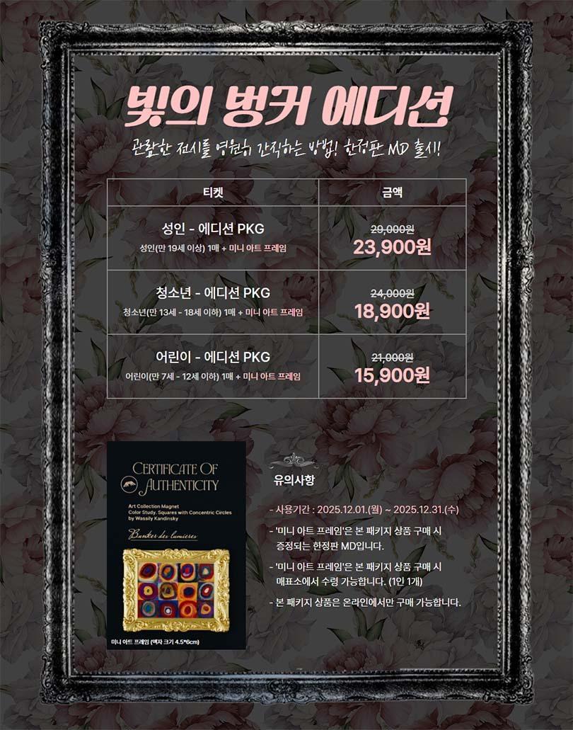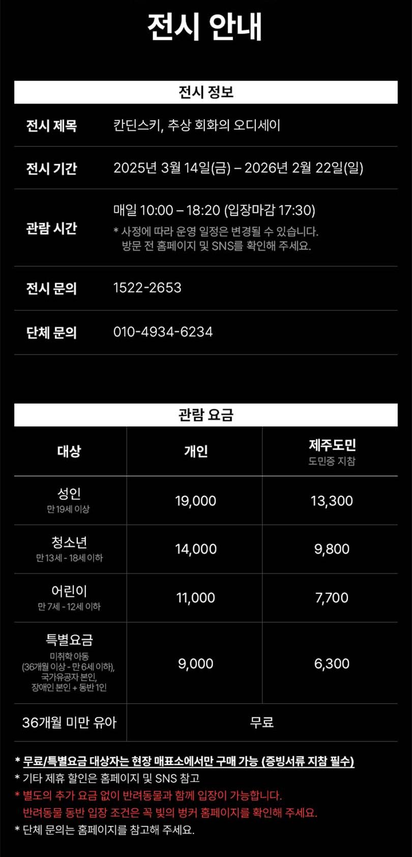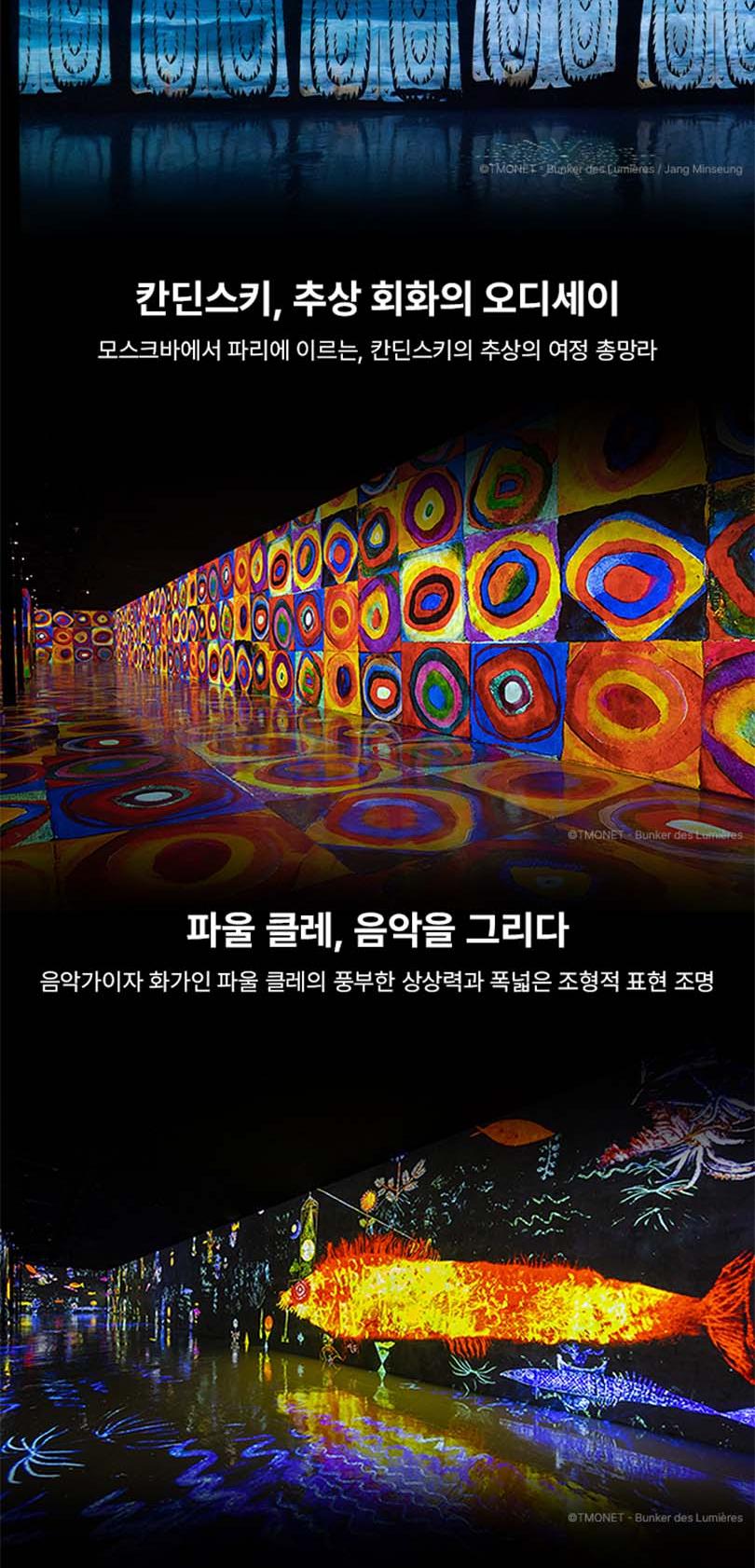 빛의 벙커는 옛 국가기간 통신시설이었던 벙커를 국내 유일 몰입형 예술 전시관으로 재탄생시킨 문화 재생 공간이에요. 신규 전시 '칸딘스키, 추상 회화의 오디세이'는 모스크바에서 파리에 이르는 칸딘스키의 추상 여정을 따라가며 그가 평생에 걸쳐 추구했던 영적 탐구를 조명하고 있어요. 역동적으로 되살아나는 전시와 함께 제주도에서 잊지 못할 추억을 가득 남겨보세요!