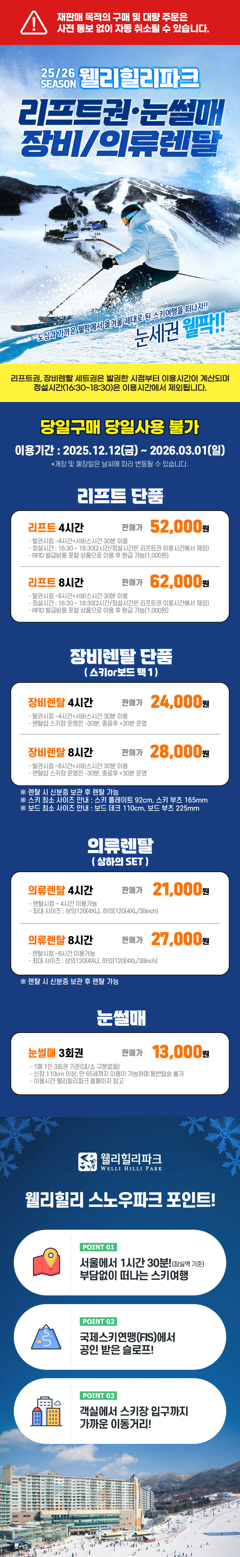국제 스키 연맹(FIS)에서 공인받은 수준 높은 슬로프는 초보·중급·상급 모두 즐길 수 있고, 리조트 객실에서 스키장 입구까지 이동이 매우 가까워 이동 스트레스 없이 바로 라이딩이 가능해요. 장비·의류 렌탈도 최신 시즌 프리미엄 라인업으로 준비되어 있어 초보자도 전문가처럼 스키를 즐길 수 있고, 스키가 처음이더라도 친절한 장비 피팅 안내와 사이즈 조정으로 걱정 없이 이용할 수 있어요👍 낮에는 탁 트인 설경, 저녁에는 화려한 야간 라이딩까지 분위기가 완전히 달라져 두 번 즐기는 재미가 있고 가족 단위 방문객에게 인기 만점인 눈썰매장도 준비되어 있어 아이들과 함께하는 겨울놀이도 가능합니다. 특히 웰리힐리 특유의 넓고 개방감 있는 슬로프, 빠른 리프트 회전률, 그리고 적설 관리가 잘 되어 있어 라이딩 퀄리티가 매우 높은 것이 가장 큰 장점이에요!🛷❄️