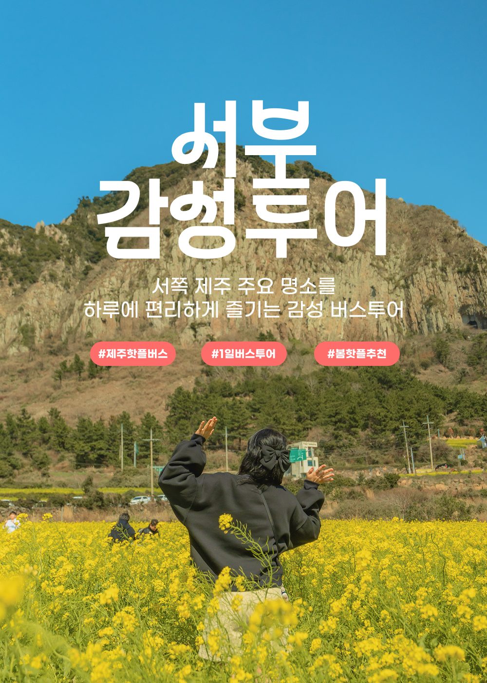아름다운 청정자연을 가진 섬이지만 뚜벅이에게는 망설여지는 제주 여행! 차가 없어도 쉽게 만끽할 수 있는 일일 버스 투어를 소개할게요. 제주 투어 전문가가 엄선해 기획한 코스를 기사님이 운전해 주시는 버스를 타고 편안하게 방문하고, 목적지에서는 자유롭게 여행을 즐길 수 있어 패키지 투어와 자유여행의 장점을 모두 가지고 있어요.