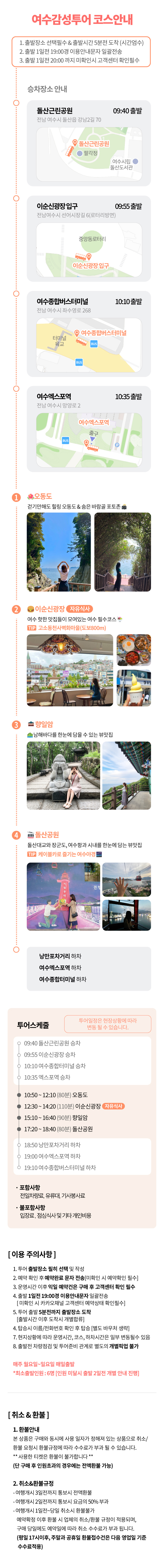 여수에서 감성 가득한 바다와 고즈넉한 명소들을 편안하게 여행하고 싶으신가요? 여수 감성 버스투어는 운전 부담, 복잡한 대중교통, 무거운 짐 걱정 없이 여수의 매력을 만끽할 수 있는 최고의 선택이에요! 베테랑 운전 팀장님이 운전하는 전용 버스를 타고, 여수의 아름다운 풍경과 특별한 감성을 자유롭게 여행하며 잊지 못할 추억을 만들어 보세요.